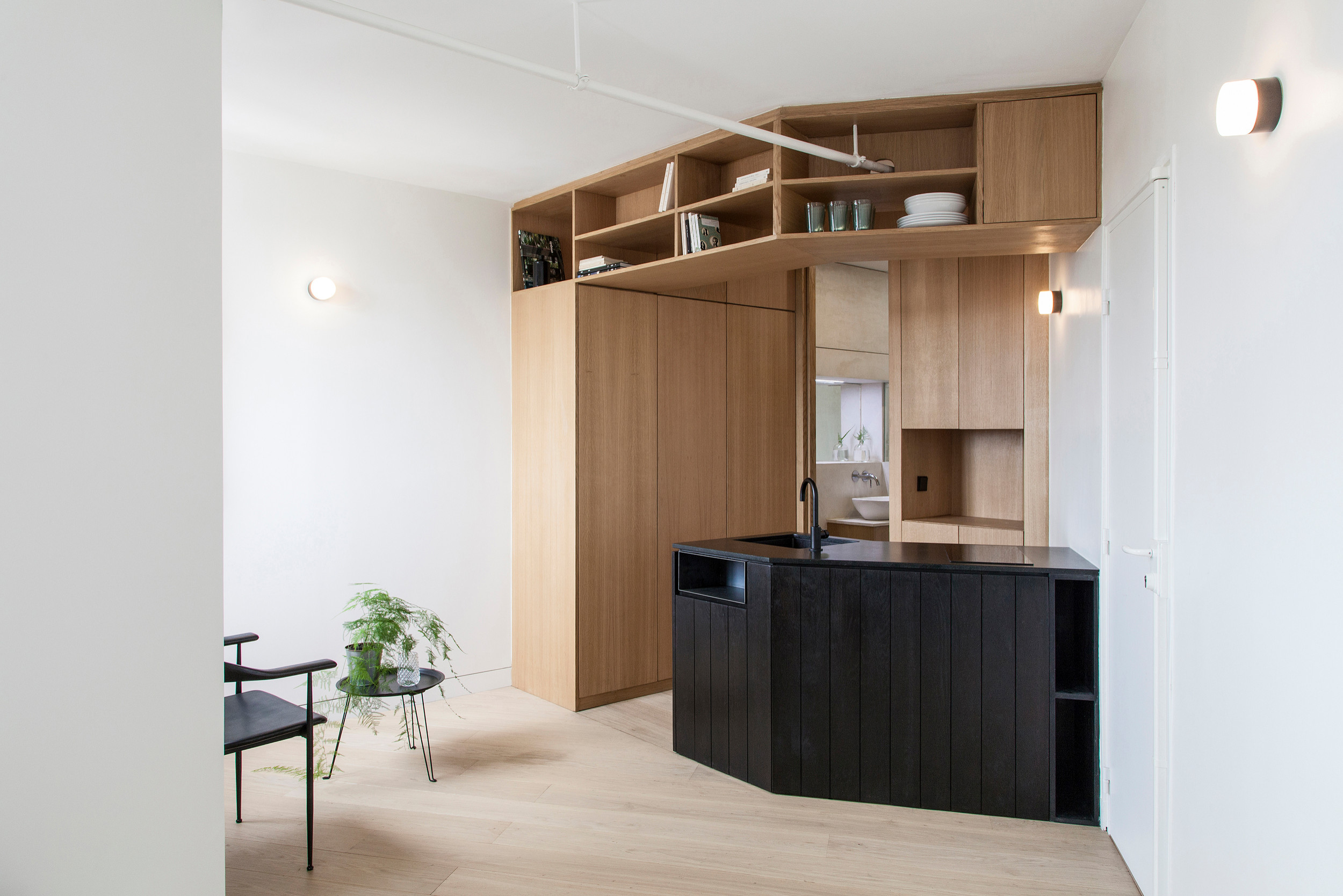 Si au contraire vous ne recherchez pas à tout prix à minimiser visuellement la cuisine, faites en sorte de la rendre intéressante. Les architectes Eva Gourdon et Chloé Leymarie ont par exemple transformé la cuisine de ce studio de 20 m² avenue Niel à Paris en véritable bijou. Le contour de la porte qui mène à la salle de bains a été habillé de rangements en bois sur lesquels tranche le linéaire noir.