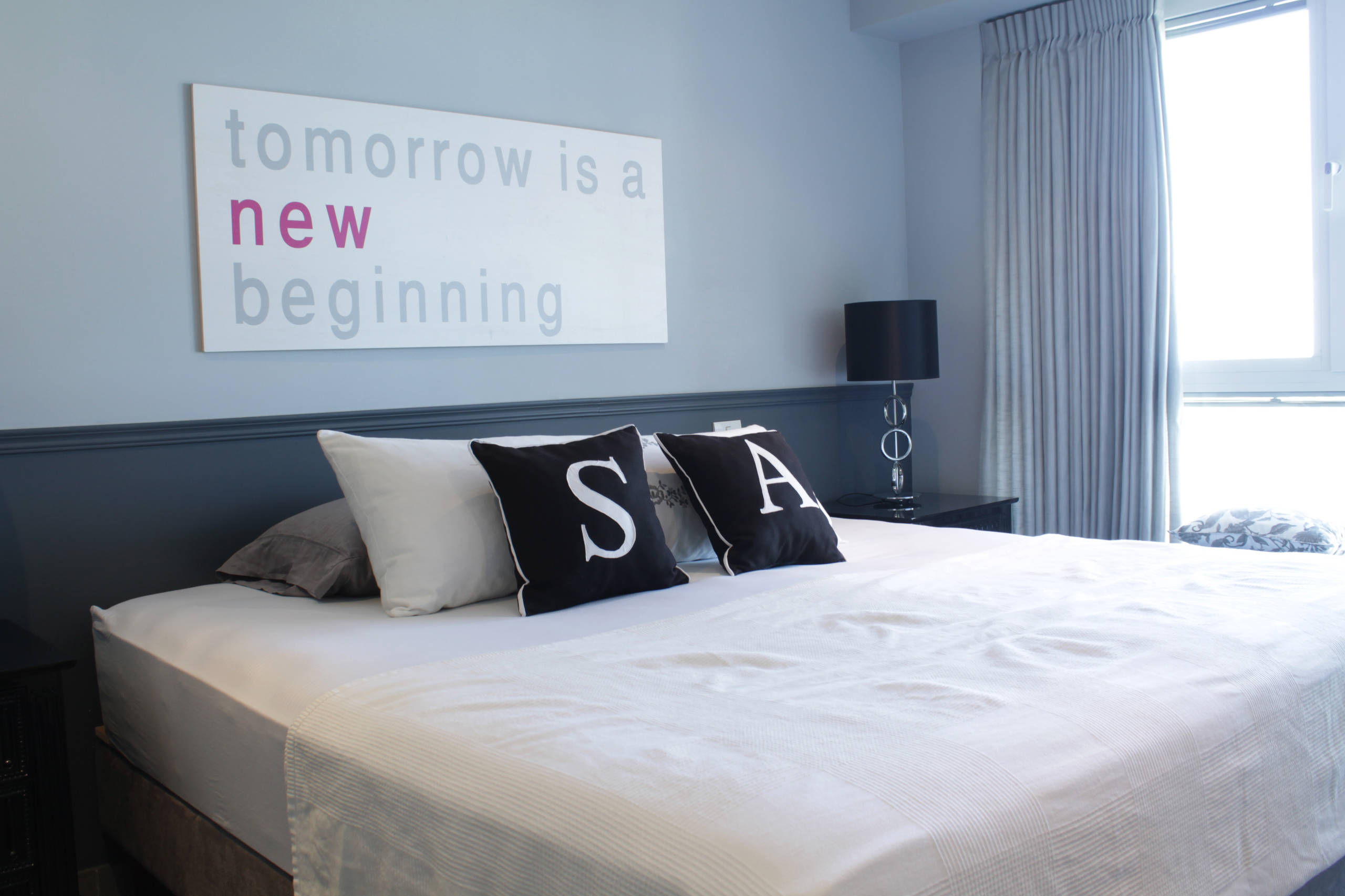 Un message inscrit en gris et rose fuchsia sur un tableau blanc, s’affiche au-dessus du lit. Une pensée positive pour réconforter ceux qui ont eu une rude journée, en leur rappelant que demain est un autre jour. Et potentiellement un nouveau départ…