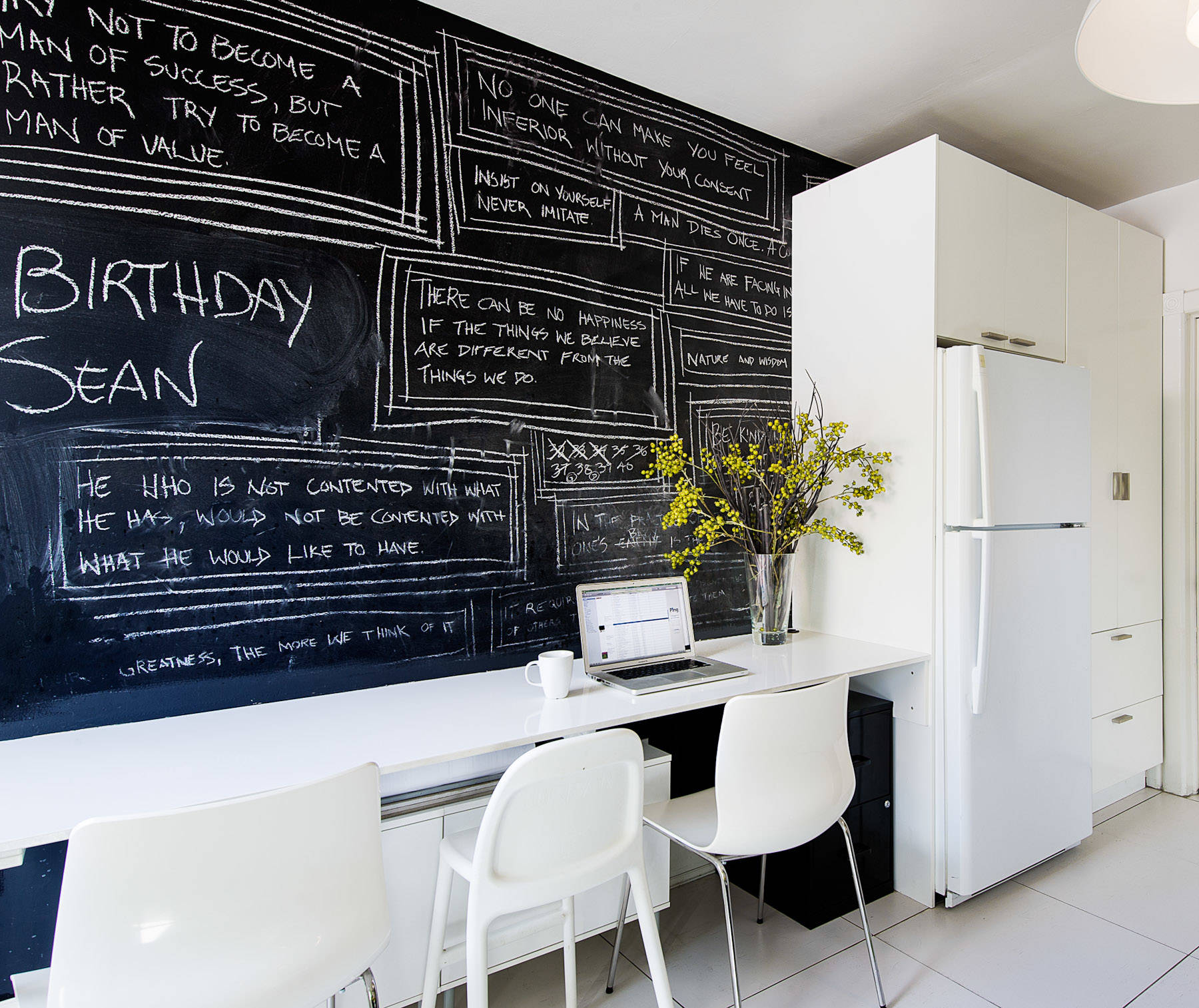 Et si vous voulez pousser l’idée encore plus loin, vous pouvez oser un pan de mur complet de votre cuisine en version tableau noir. Dans ce cas, préférez un mobilier blanc, qui tranchera et donnera un caractère épuré à votre cuisine. Y compris si elle est couverte d’écritures.