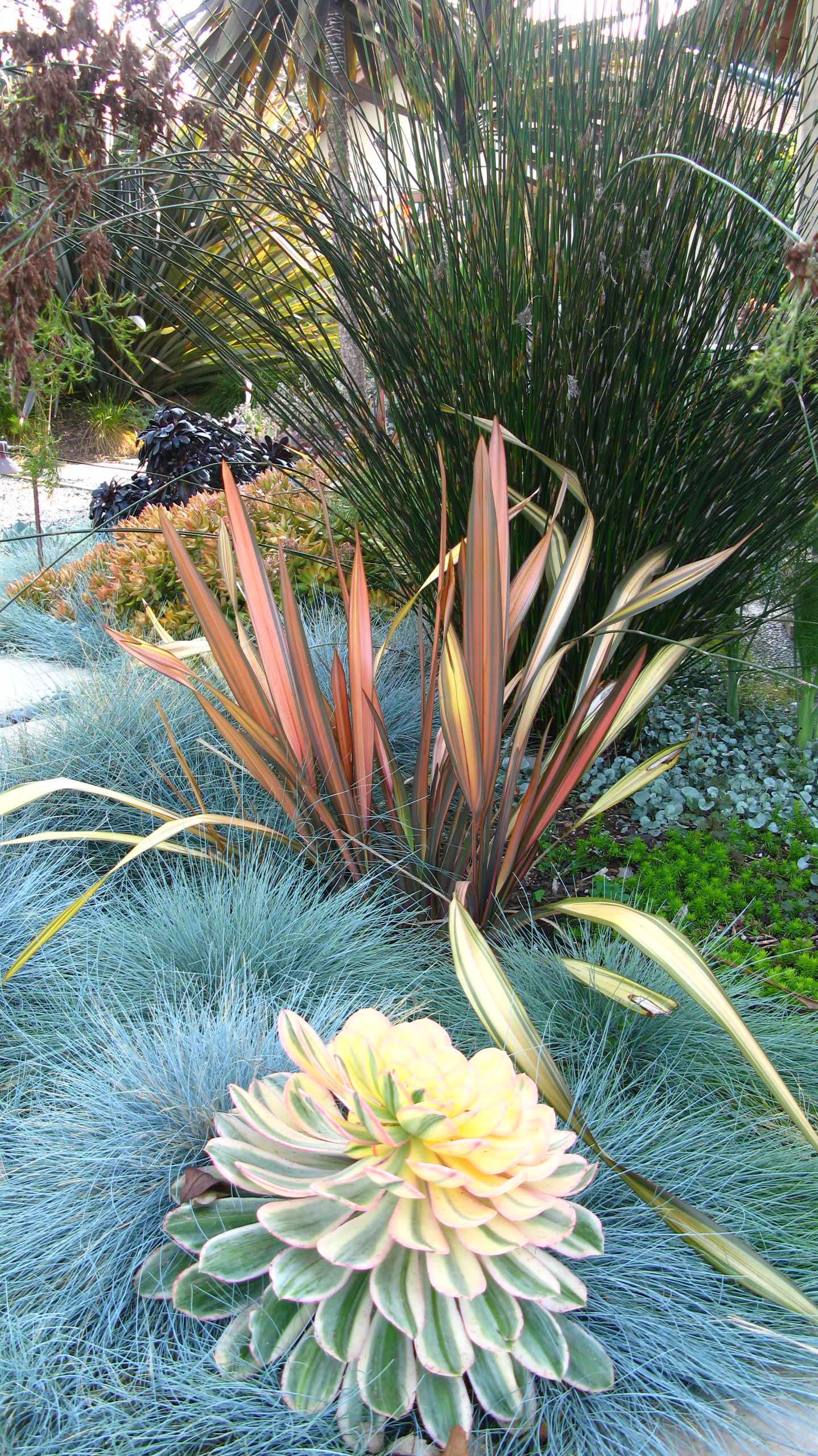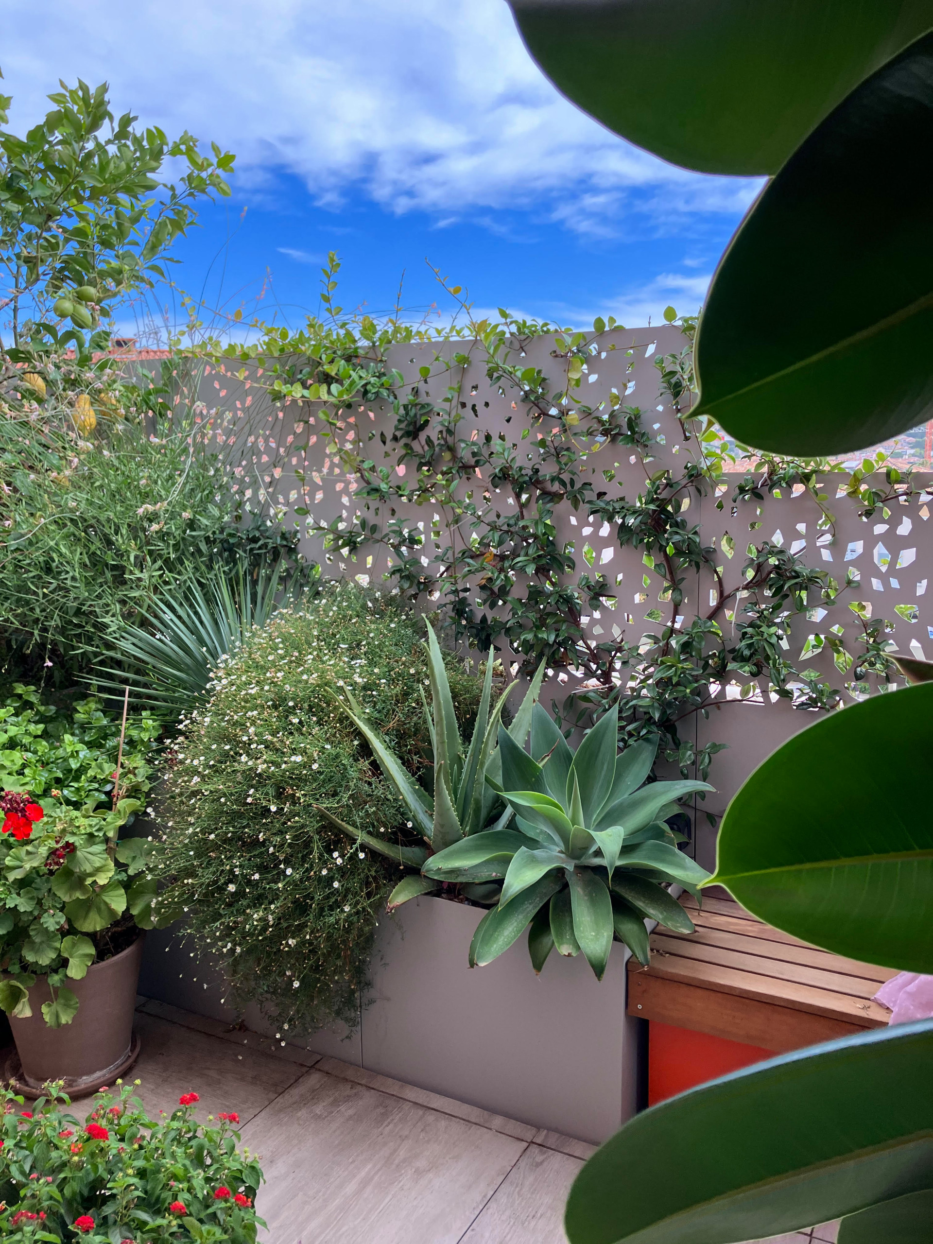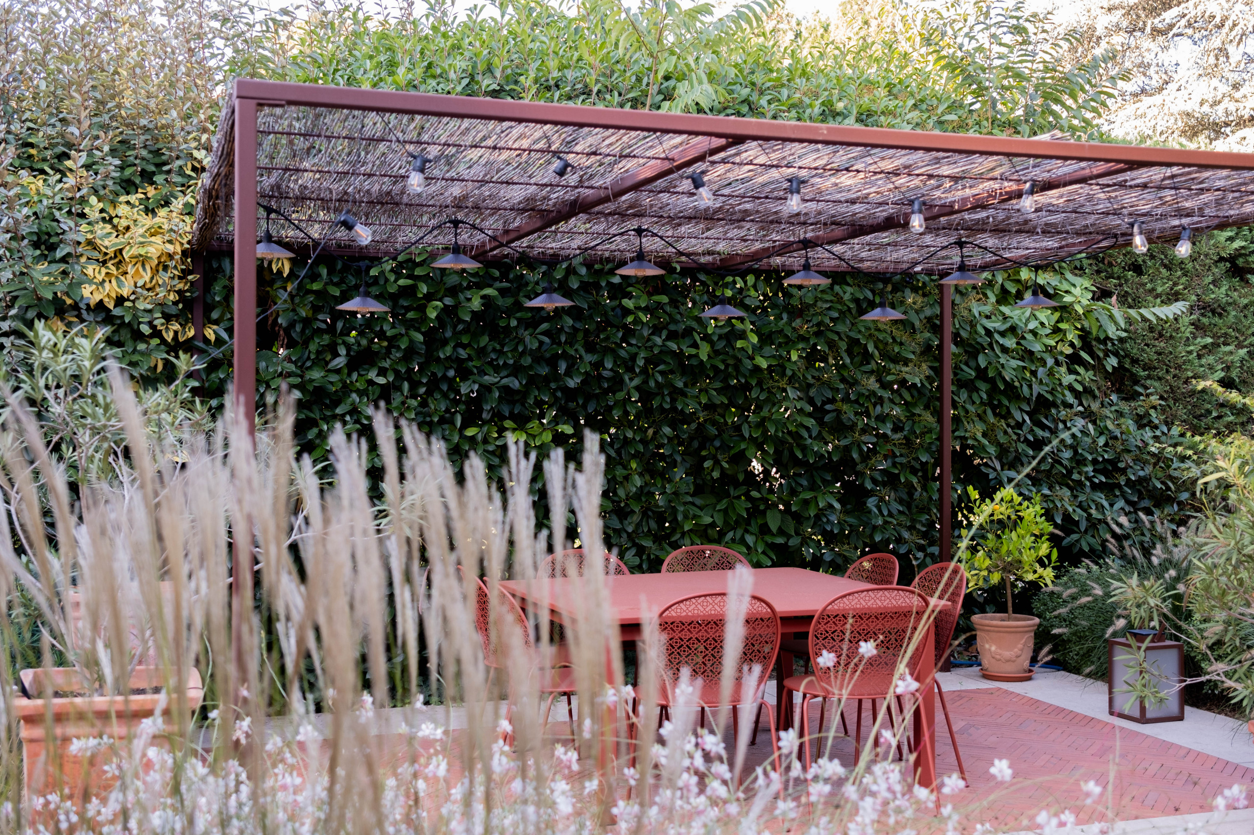 Ce type de végétation dense et verdoyante permet de créer des espace privilégiés où s’isoler et se mettre à l’abris des regards. L’effet « jungle », avec des végétaux de type méditerranéen et exotique, est très recherché cette année. La légèreté des graminées, mariée à la couleur vive de la verveine de Buenos Aires, s’accompagnée par exemple de l’odeur symbolique du Romarin. Les végétaux exotiques aux feuillages graphiques s’opposent aux végétaux méditerranéens et invitent à l’évasion.