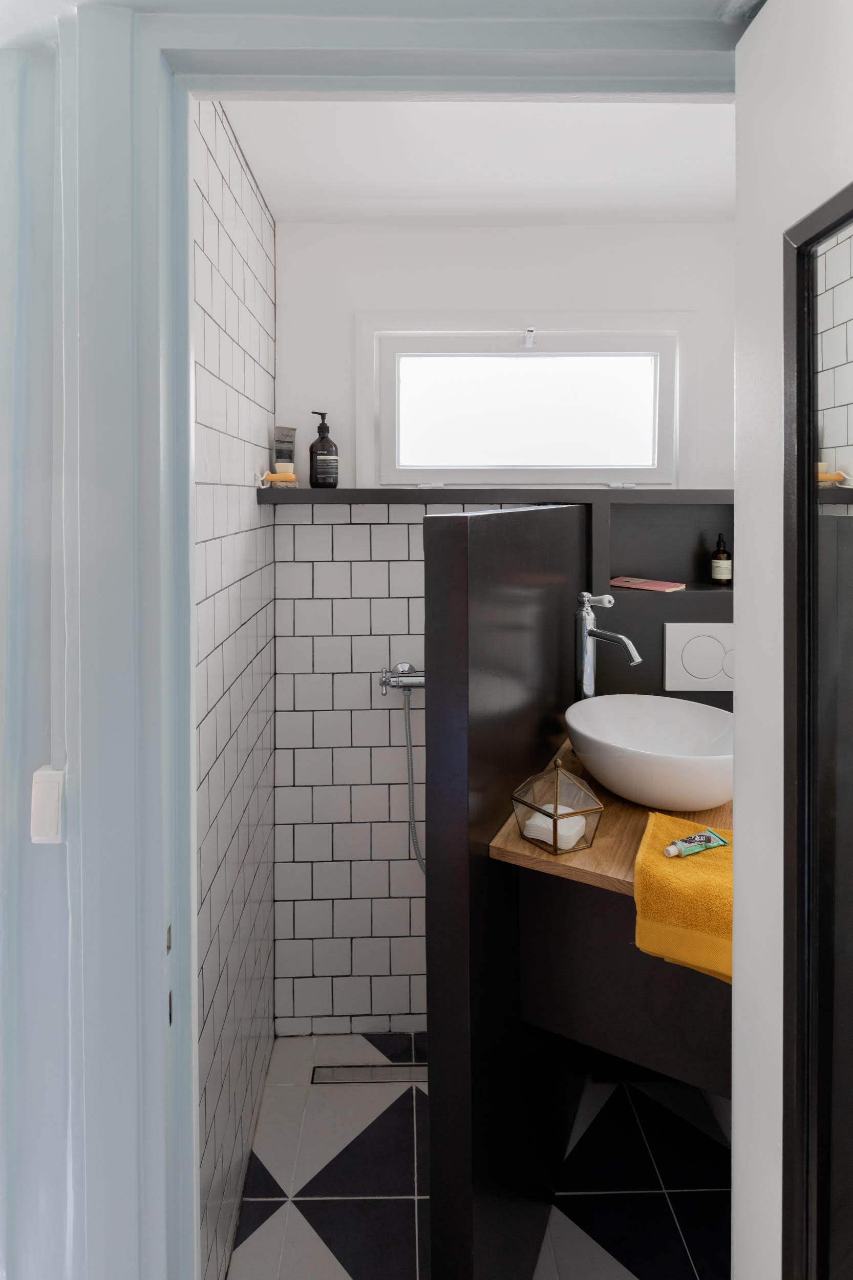Pour intégrer vasque, douche et WC dans cet espace d’une superficie de 1,40 m², la professionnelle a imaginé une paroi mobile, montée sur pivot, accueillant un meuble vasque suspendu et renfermant l’espace douche.