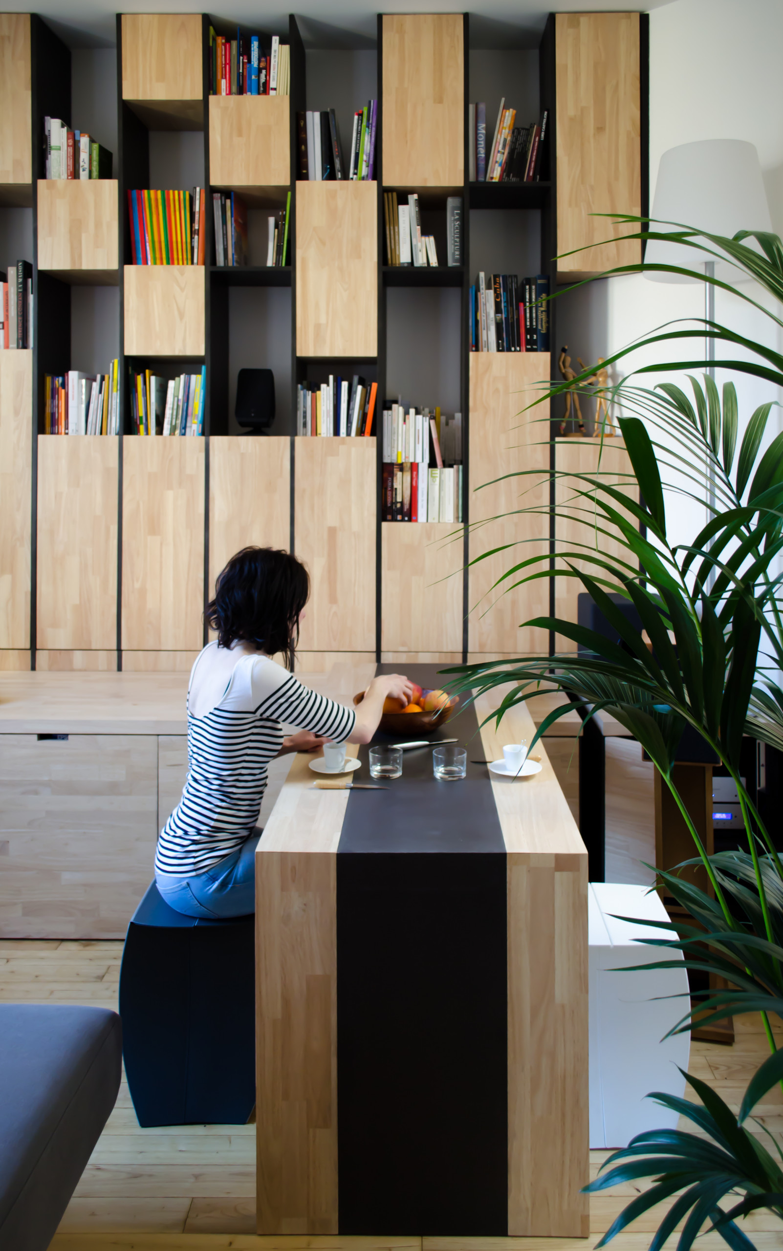 Dans la pièce à vivre, un grand système modulable toute hauteur mêlant bois clair et medium noir teinté dans la masse abrite une grande bibliothèque, la télévision, un bureau compact et une table de repas qui peut être déployée dans deux positions différentes, parallèlement à la structure ou à 90 degrés pour accueillir six convives.