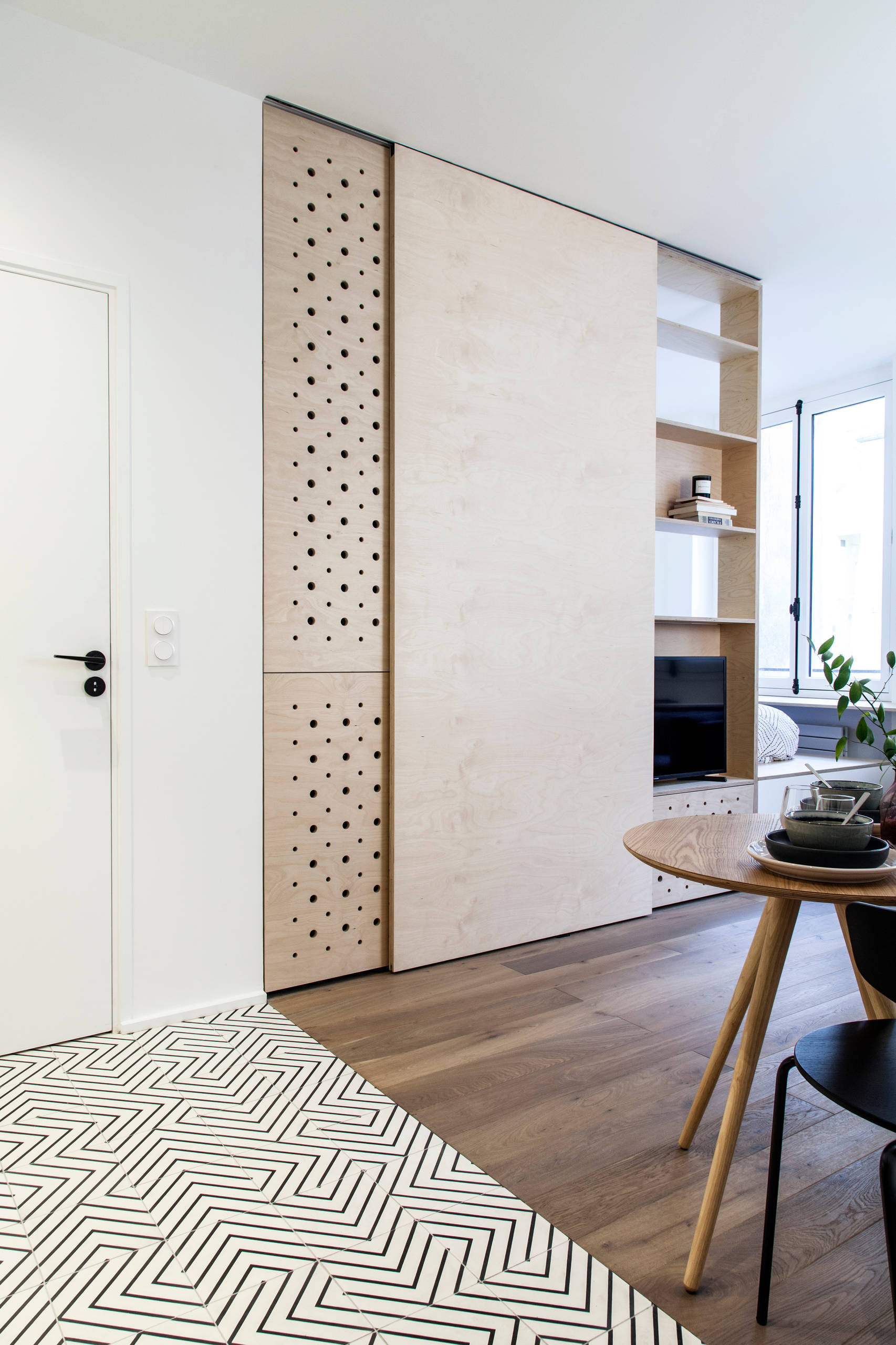 Ce studio de 26 m², niché dans le quartier Montorgueil, à Paris, mêle blanc et bois clair pour créer un havre de paix aux accents nordiques. Un panneau en contreplaqué de bouleau délimite l’espace nuit et le salon sans cloisonner. Celle-ci permet de moduler l’espace en fonction des besoins et des envies pour cacher l’accès à la chambre, les placards recouverts d’un panneau ajouré ou la bibliothèque avec meuble TV intégré.