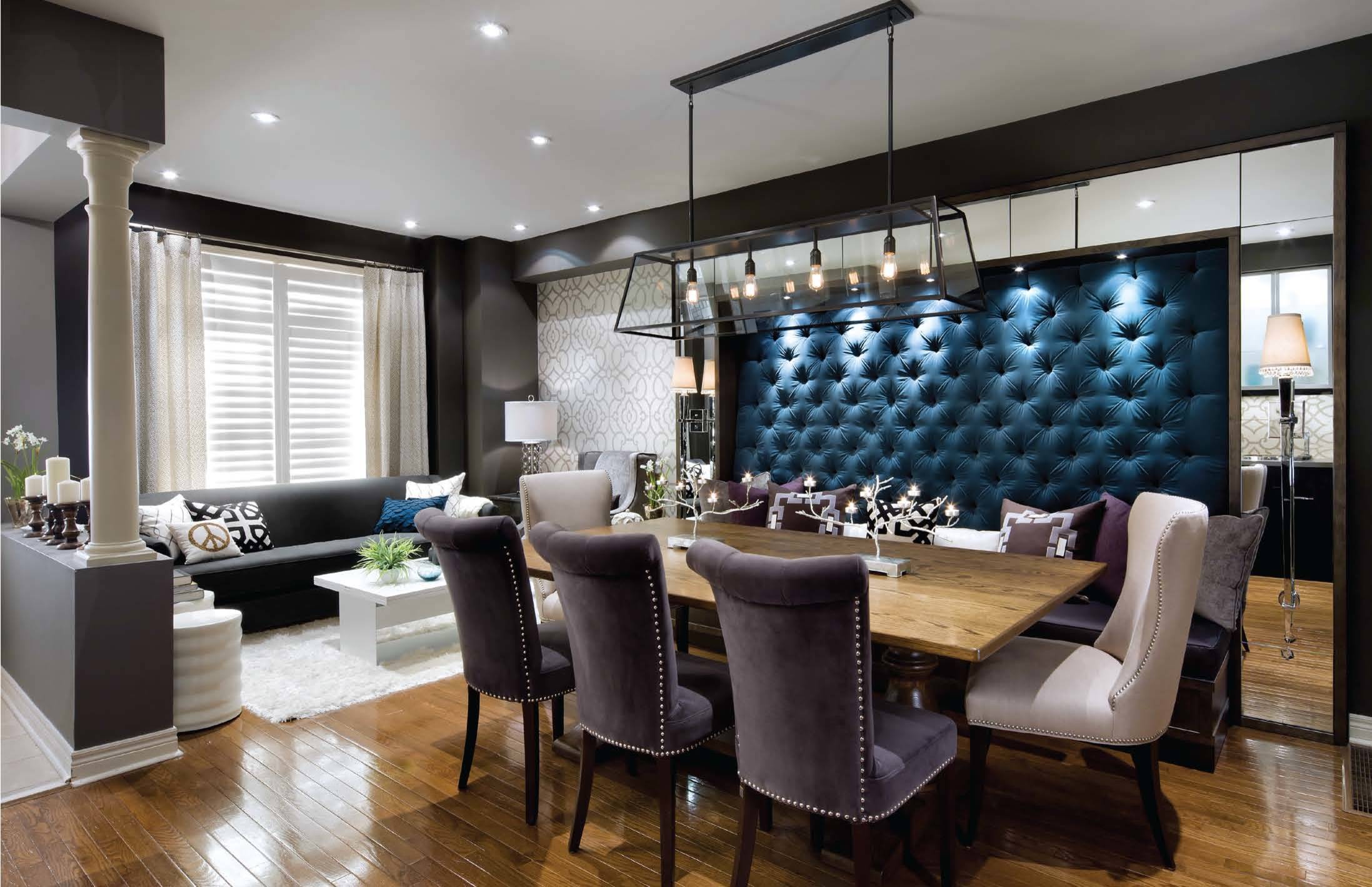 Voici un décor monumental, savamment élaboré autour d’une simple table en bois. Encadré par des miroirs et agrémenté de spots, le dossier capitonné de la banquette s’étend généreusement sur toute la niche. La banquette en cuir noir s’accorde à un dossier bleu intense et très élégant : une installation confortable complétée par de jolis coussins. Cette mise en scène apporte une note grandiose à la décoration de la salle à manger.