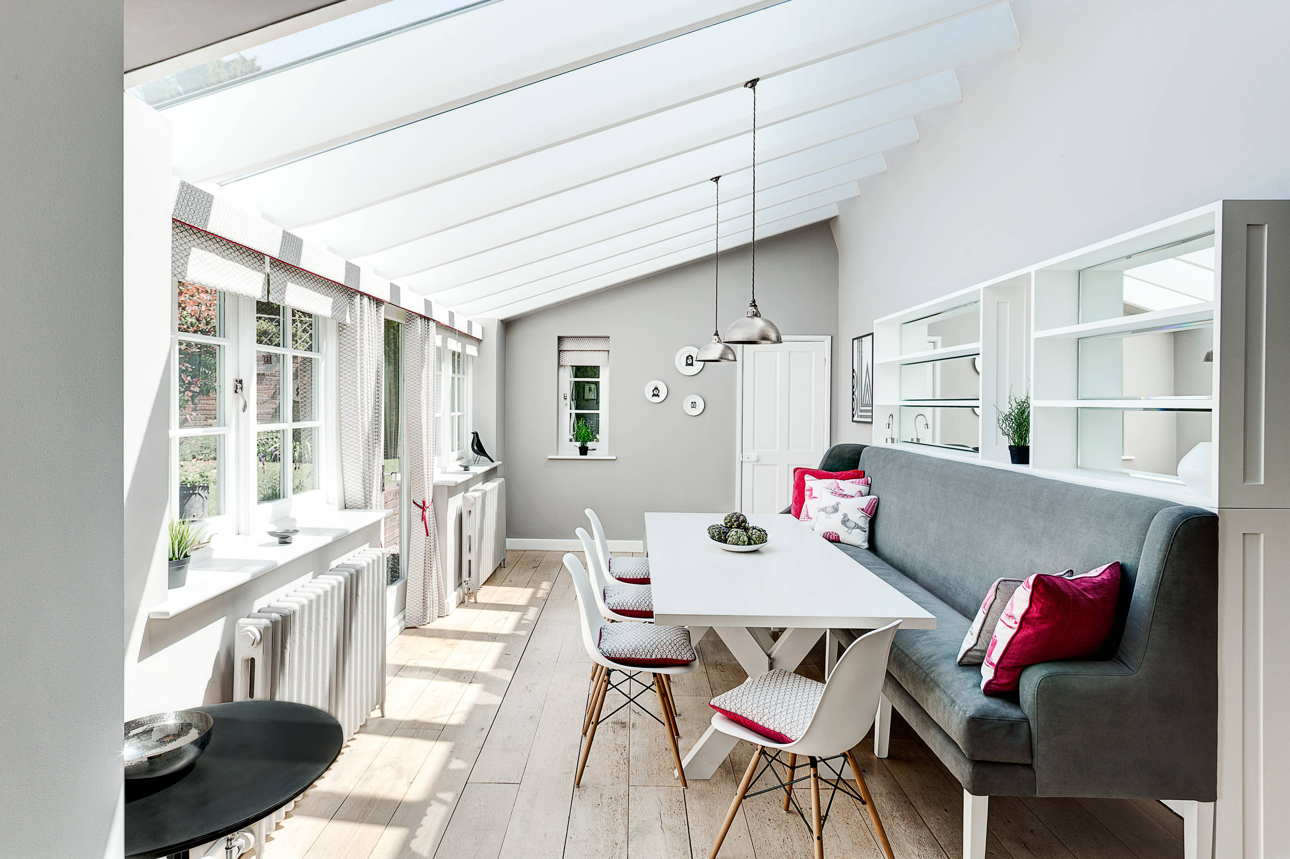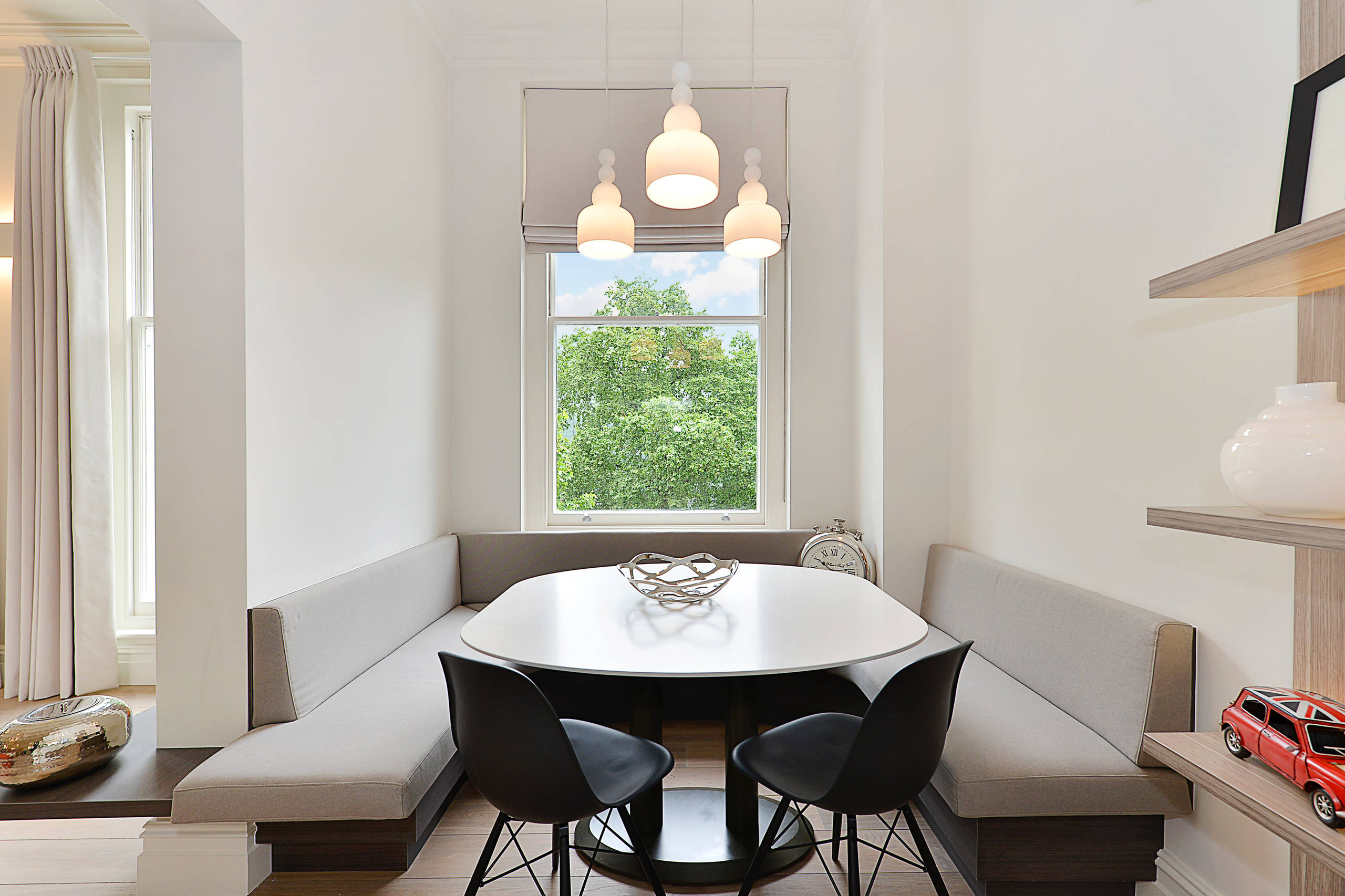 Des chaises n’auraient pas suffi à tirer pleinement parti de ce petit espace. Agencées en U, trois banquettes suivent en revanche parfaitement l’architecture et identifient à elles seules une zone repas conviviale. Côté déco, les teintes utilisées s’harmonisent en douceur tandis que la fenêtre offre une échappée visuelle qui renforce la perspective de l’aménagement.