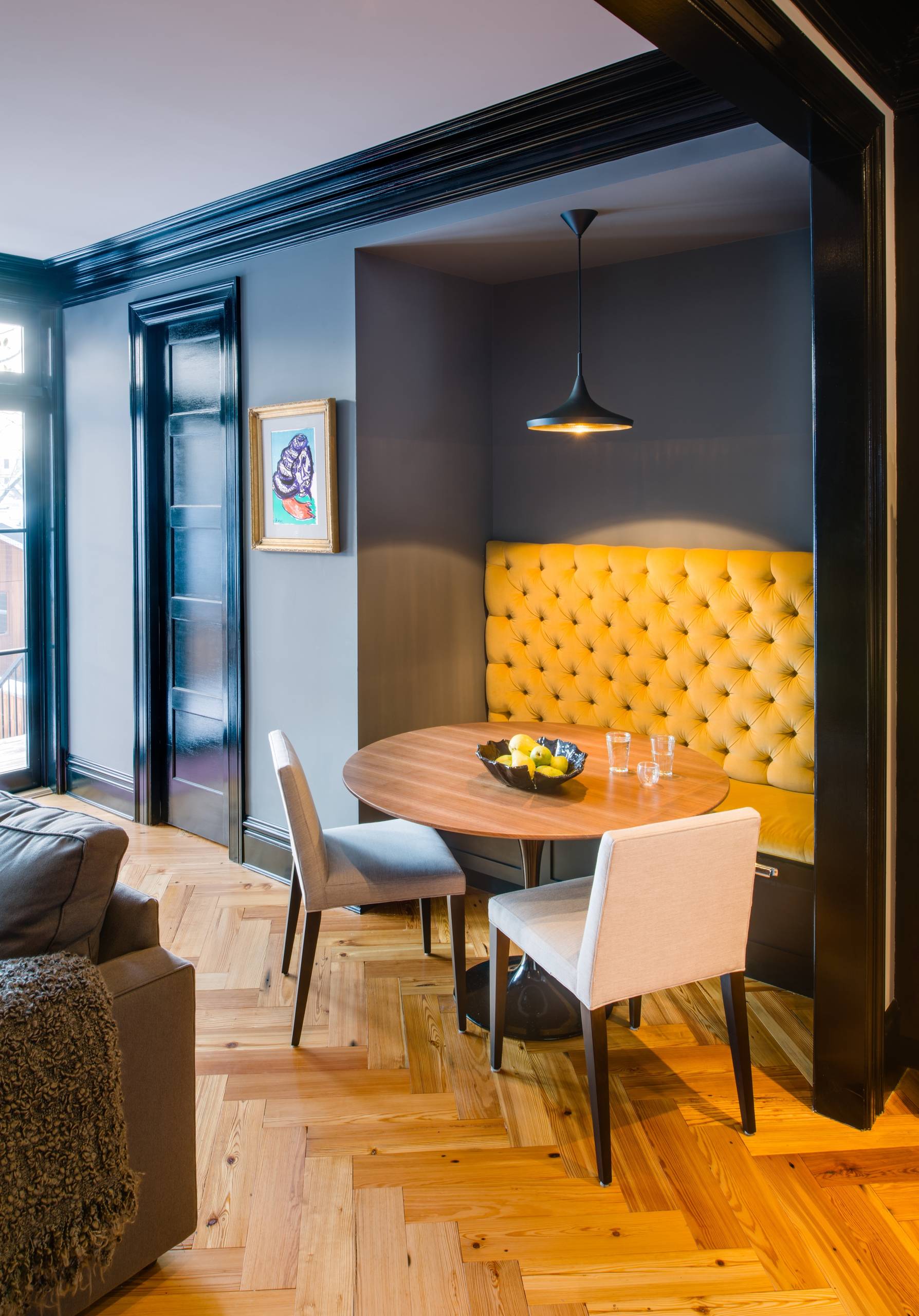Mise en lumière par une suspension, cette banquette jaune d’or au dossier capitonné réveille un recoin sombre et lui attribue une fonction de coin repas. Pour ce type d’aménagement, le mieux est de vous tourner vers le sur-mesure.