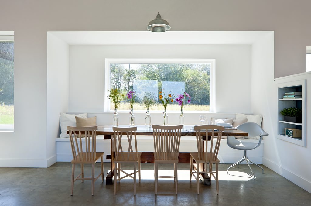 Cette banquette d’un blanc immaculé s’efface au profit de la vue et se fond dans le décor. Encastrée dans une niche préexistante, sous la fenêtre, elle bénéficie d’une belle luminosité renforcée par la blancheur des murs. Cette installation harmonieuse favorise un usage varié et régulier de la banquette en dehors des repas : canapé d’appoint, coin lecture, bureau improvisé…