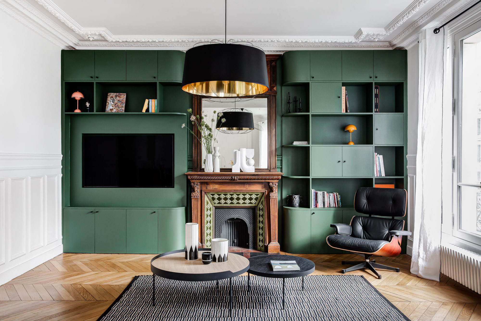 Pas forcément, voire, surtout pas. Mieux vaut éviter de vous retrouver à vivre comme au XIXᵉ siècle, du temps de Napoléon III et du baron Haussmann avec des chaises de salon bien basses, un éclairage à la bougie… Dans cet appartement de Paris, l’encadrement du mobilier sur mesure aux angles courbes est juste vert, comme les carreaux de la cheminée XIXᵉ. Le mobilier design XXᵉ siècle se pose harmonieusement sur le parquet en point de Hongrie.