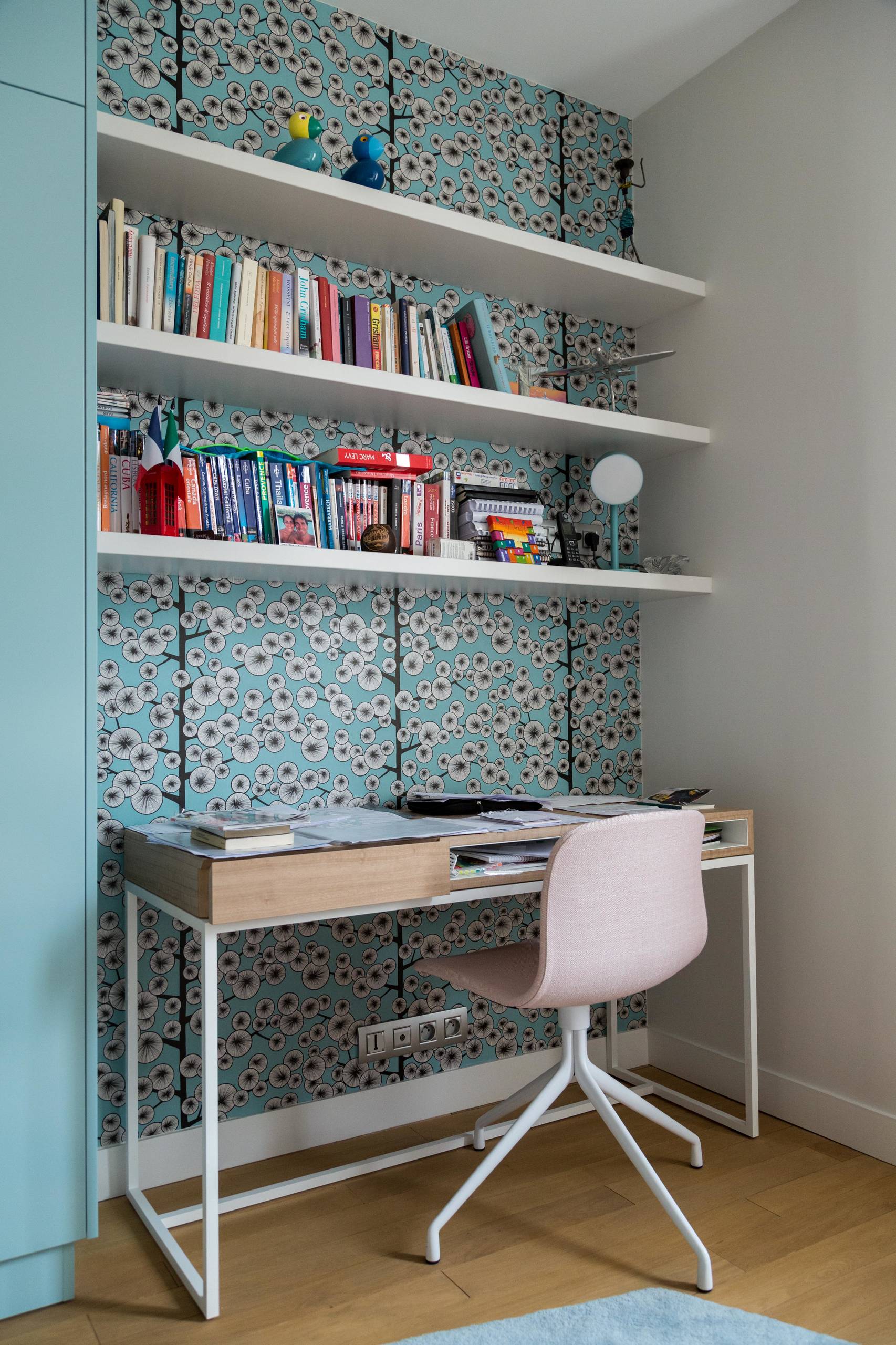 Pour travailler efficacement à la maison, il faut un environnement propice. Outre un espace bien aménagé avec rangement, luminaire et assise confortable, il est toujours intéressant d’avoir sous les yeux un petit élément pour booster la réflexion. En couvrant d’un papier peint végétal le mur recevant le bureau dans cette chambre d’enfant, on a su donner à l’espace de travail une vraie dimension. Le bleu est la couleur idéale pour se concentrer, tandis que les volutes permettent de laisser vagabonder son esprit.
