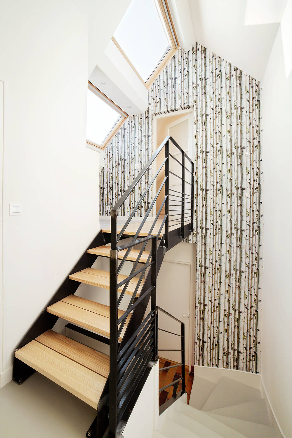 Pour souligner la belle hauteur, les architectes ont choisi d’en accentuer la verticalité. Un papier peint représentant des troncs de bouleaux stylisés habille la montée de marches. La lumière, en suivant les lignes du bois, souligne sans alourdir la magie de l’endroit.