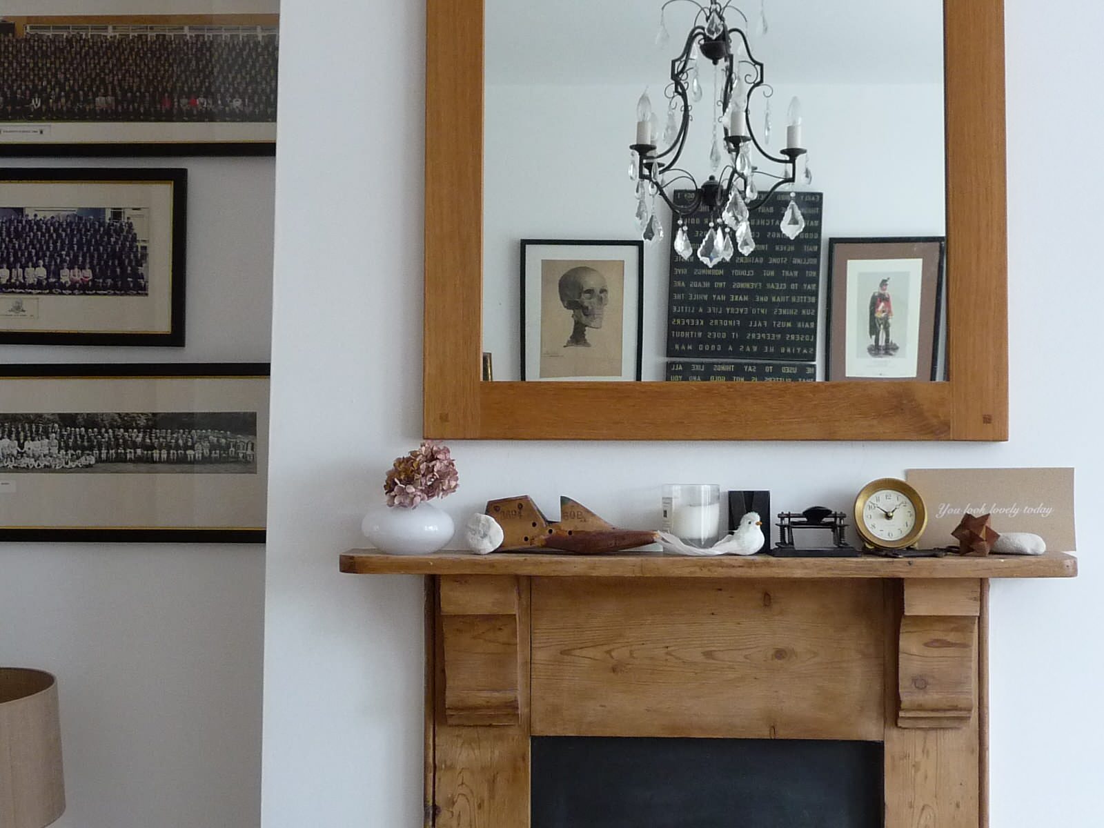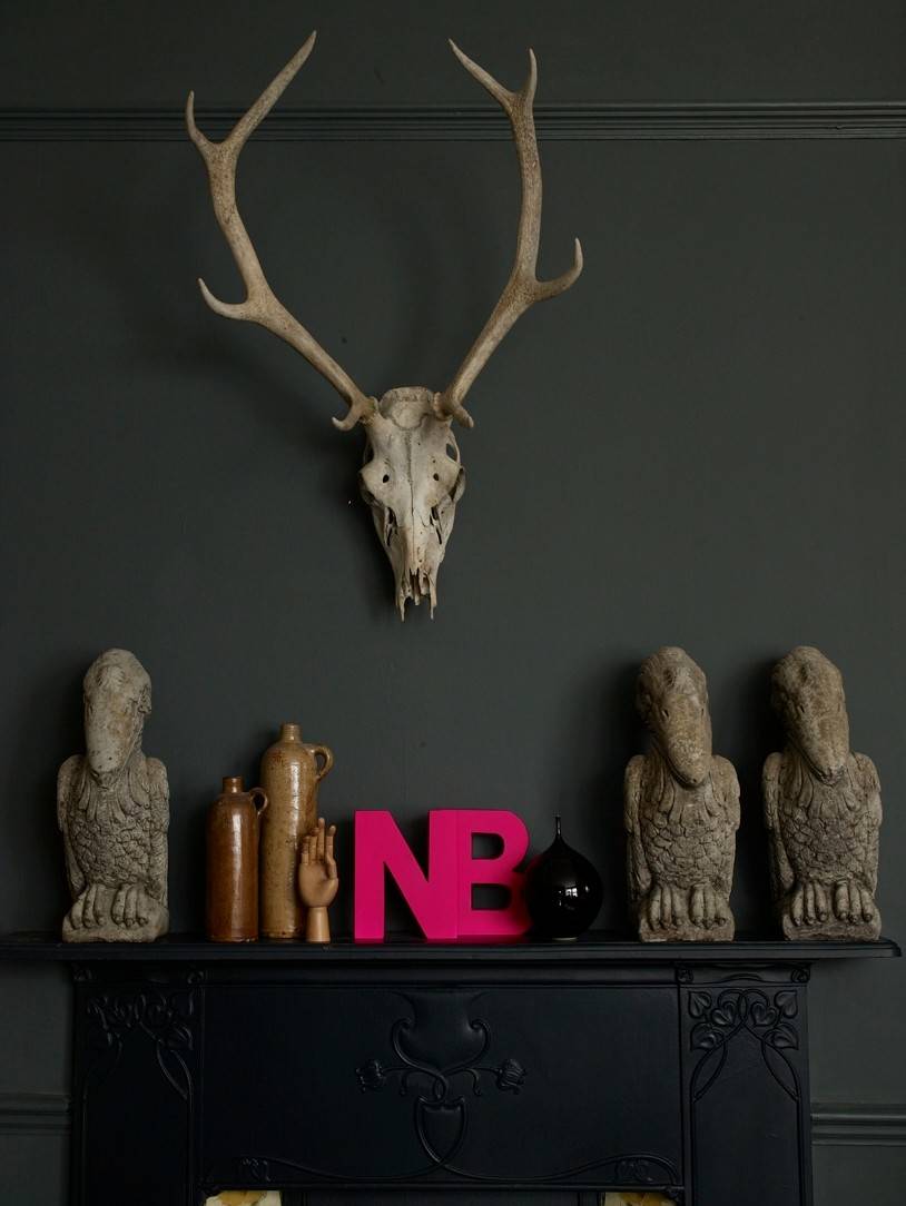 Les petits objets ne sont pas les plus adaptés à une corniche de cheminée : ils semblent très vite perdus au milieu de cet espace. Choisissez des objets plutôt larges qui feront de l’effet. Ici, le mélange d’objets pop art et gothiques attire vraiment le regard par son originalité. Les lettres rose fushia sont un beau contraste contre le mur gris et permettent de mettre en valeur les sculptures et les bois qui auraient été, sinon, trop sombres.