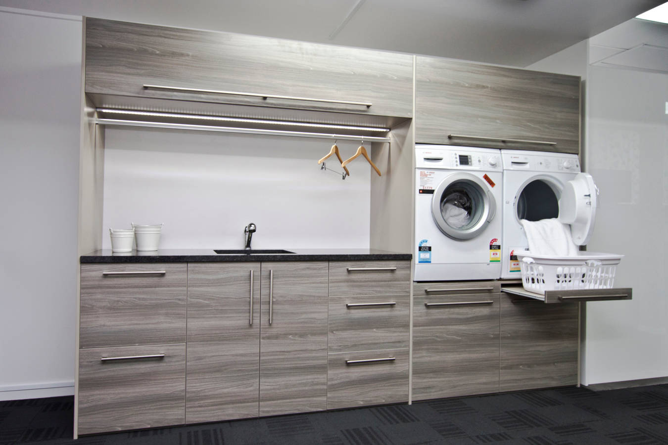 Pour avoir tous vos produits de lavage à disposition, lessives, assouplissant, détachant, javel, etc., prévoyez des rayonnages le plus près possible des machines pour avoir tout sous la main. En hauteur, c’est mieux quand vous avez des enfants en bas âge.