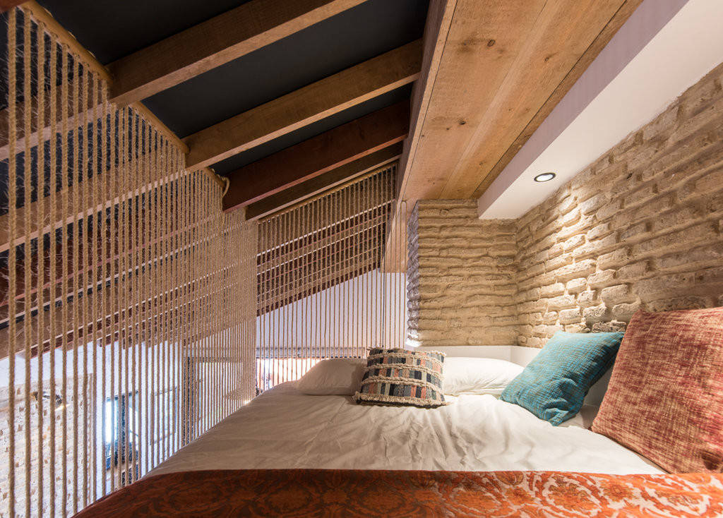 Dans ce loft de Séville, la corde de chanvre va et vient sur un châssis fixé aux poutres et au sol de cette mezzanine. Il est à prévoir une certaine longueur de métrage pour ne pas avoir à interrompre sa course par un nouage. Mais s’il le faut, n’hésitez pas à ajouter plusieurs cordes à votre arc (fixe). Visuellement, ce cordage dense est de toute beauté et assure une sécurité optimale aux occupants du lit. Un cocon qui laisse d’autant passer l’air, fort appréciable les soirs d’été.