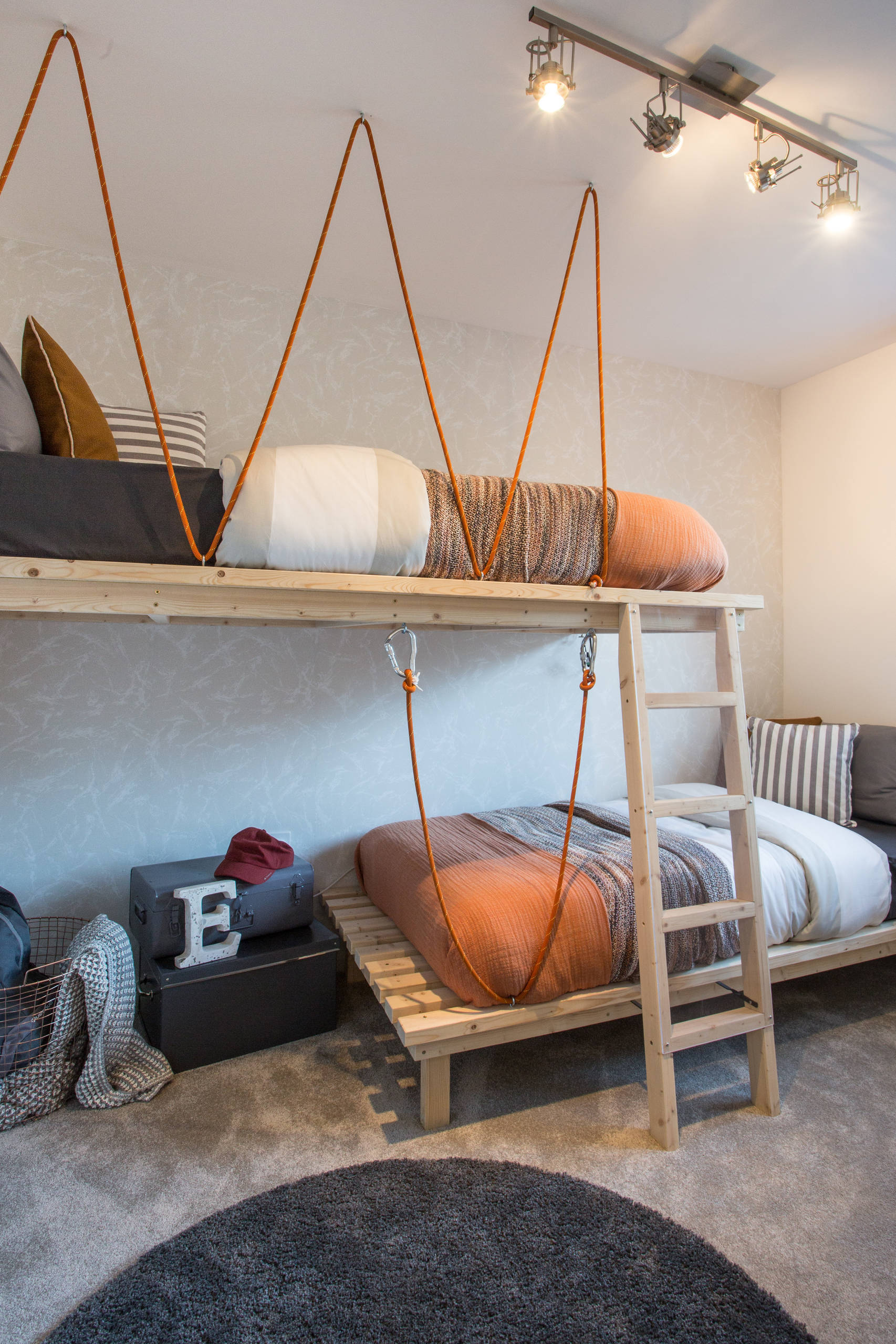 Comme la résistance d’une corde en chanvre est de plus de 1000 kg pour un gros diamètre, vous pouvez aisément en profiter pour suspendre un lit ! Soit aux quatre coins, soit d’un seul côté comme sur ce second exemple. Attention cependant à bien estimer la solidité du support de fixation : sur des poutres et non un faux plafond, un mur en ciment et non en Placo. Adaptez chevilles, crochets de fixation et révisez bien vos nœuds.