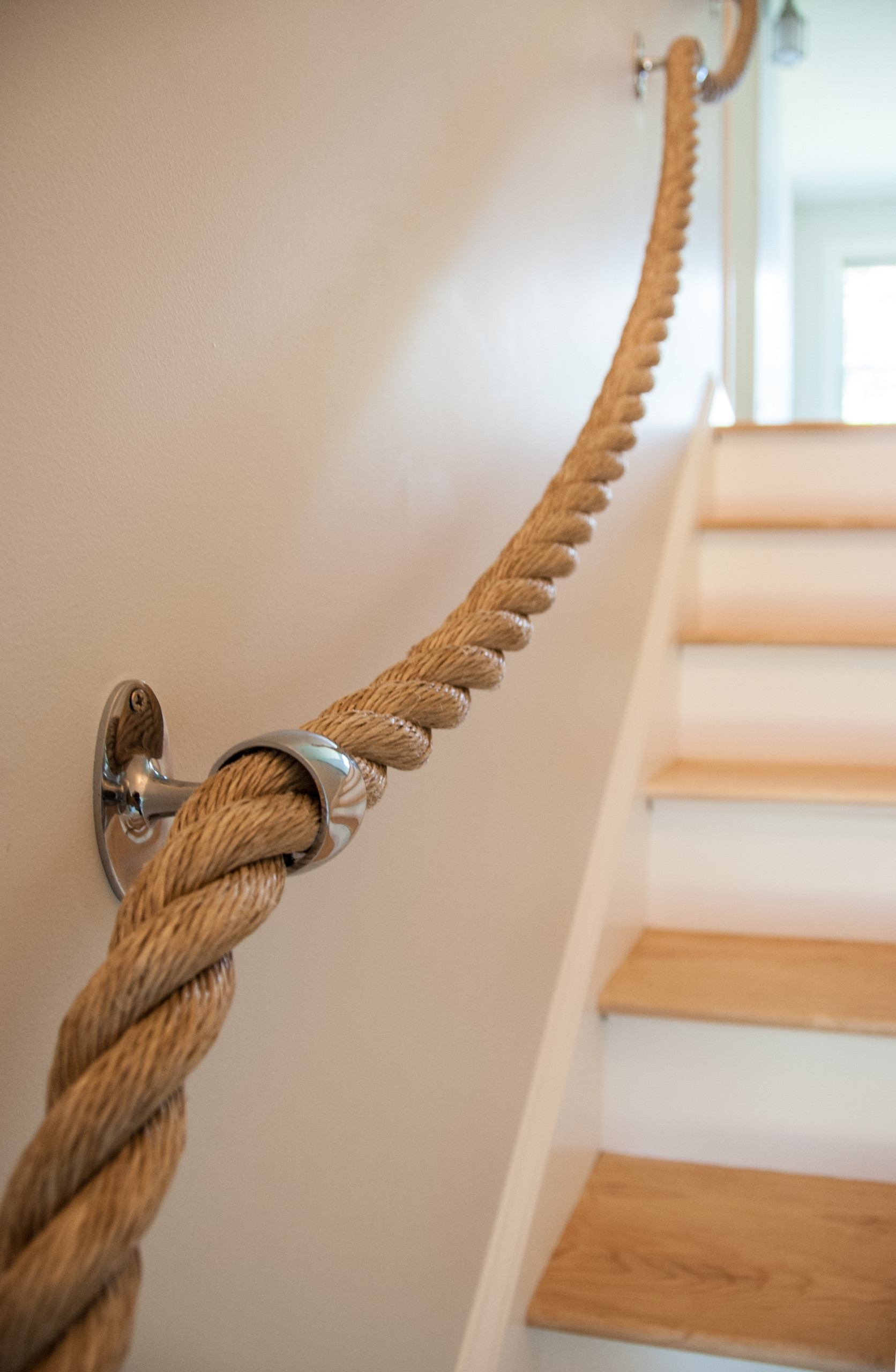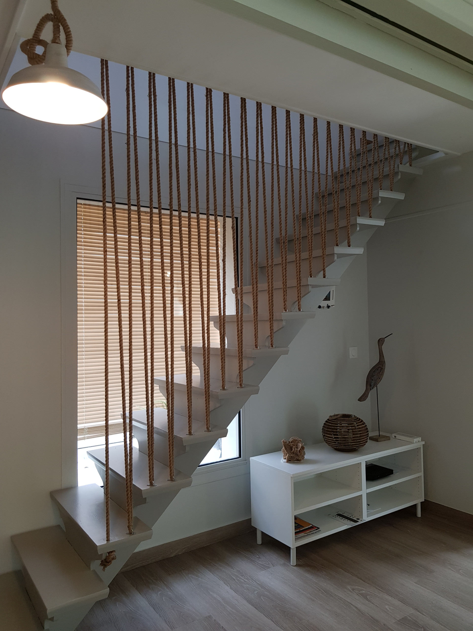 En guise de montants d’escalier, jusqu’à la rampe ou la poutre, habillez et sécurisez un escalier ou la rambarde avec un cordage de chanvre. Il est même possible de l’entrecroiser. Et illustrer l’expression : prendre des virages à la corde !