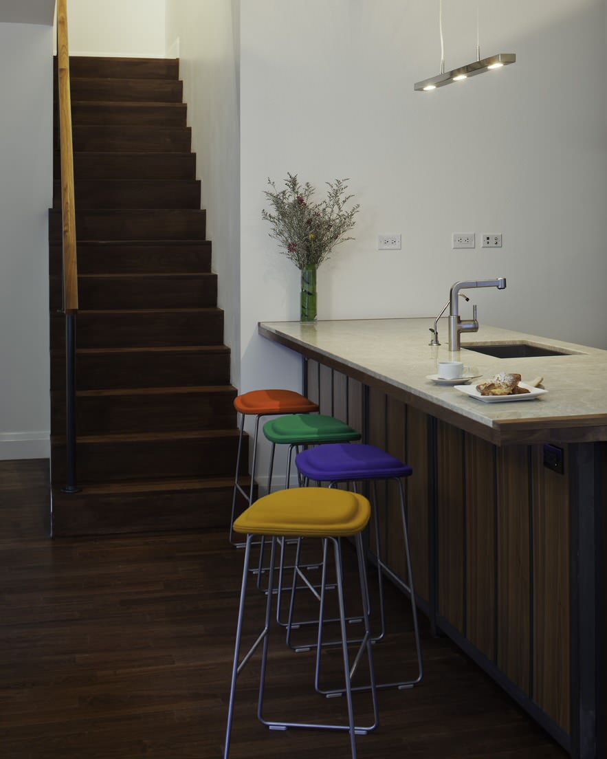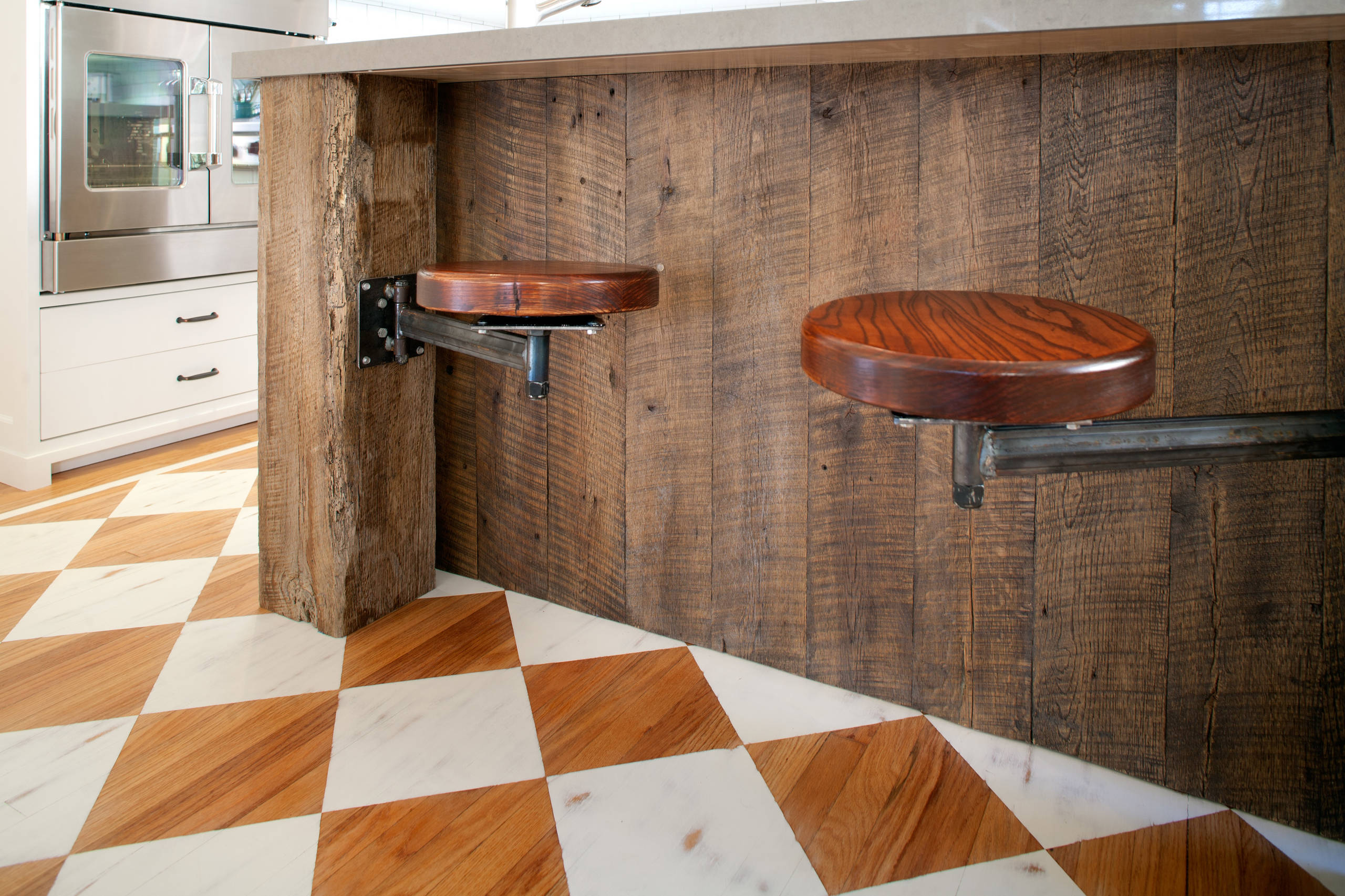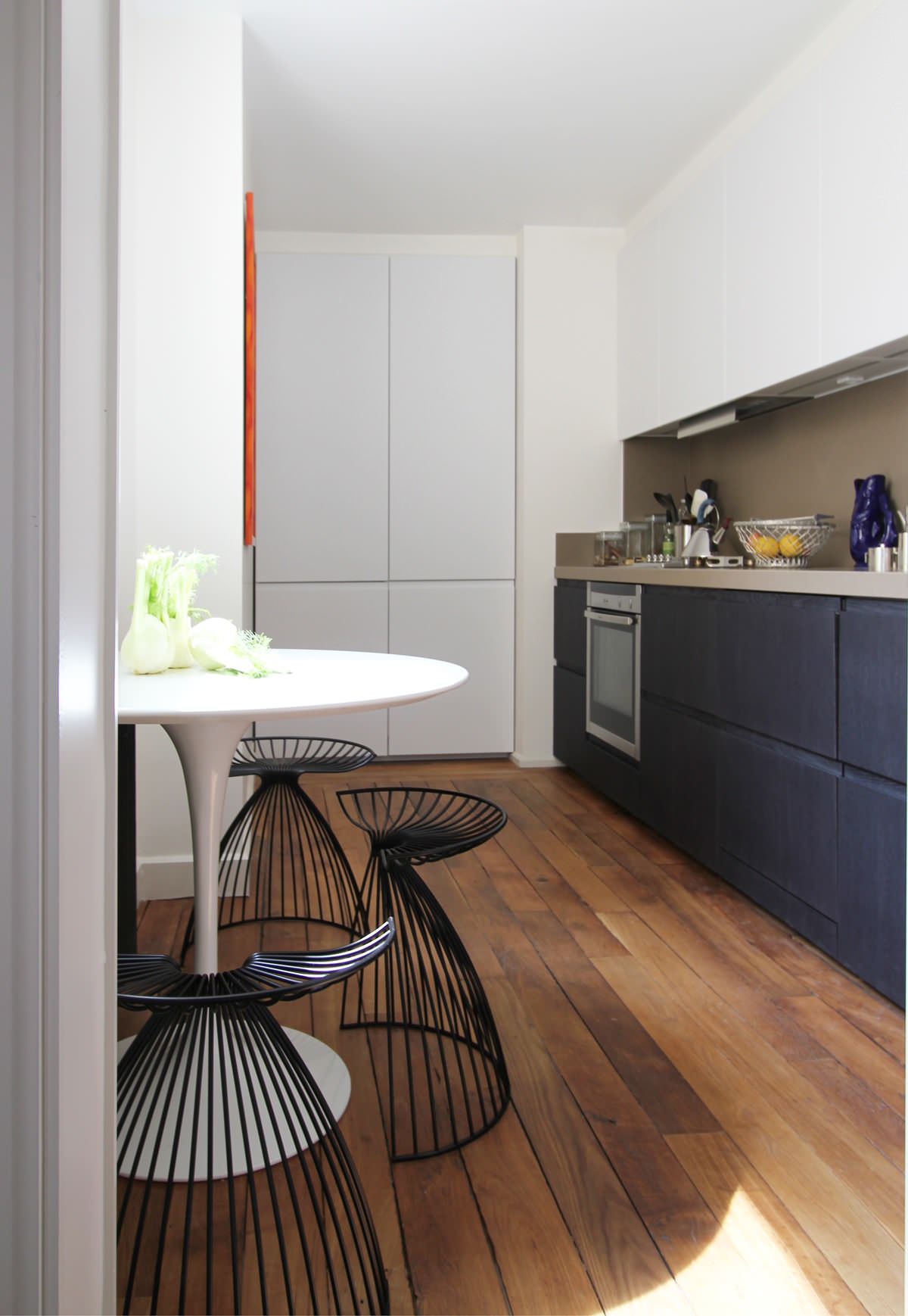 Astuce : pour un maximum de gain de place, optez pour des tabourets directement intégrés au comptoir.