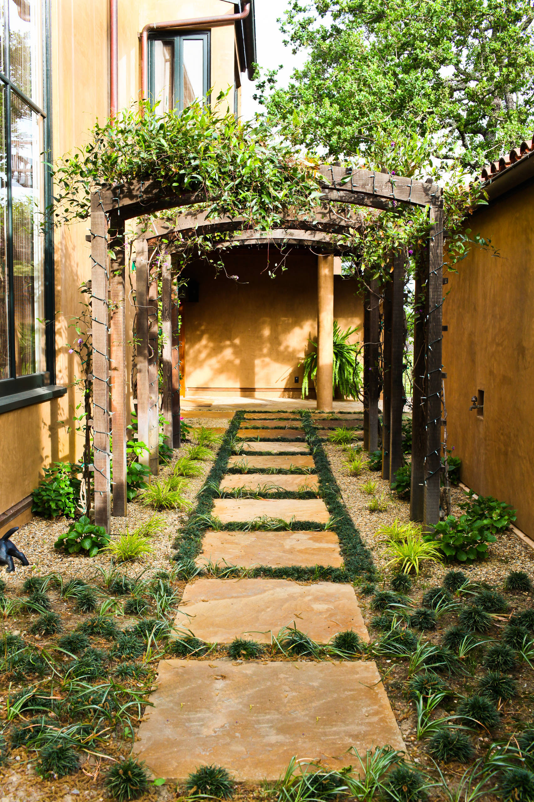 Si la propriétaire de cette maison doit fouiller son sac pour en sortir sa clé par temps de pluie, elle sera à l’abri dans cette entrée couverte. Mais plutôt que de fermer entièrement la cour, elle a choisi de conserver une ouverture, afin que le petit arbre puisse recevoir l’eau du ciel et les rayons du soleil. De cette synergie naît un microclimat. Cette astuce architecturale peut être retenue pour un arbre de plus grande taille, dont tout ou partie du houppier pourrait protéger le toit de la (trop) chaude caresse du soleil.