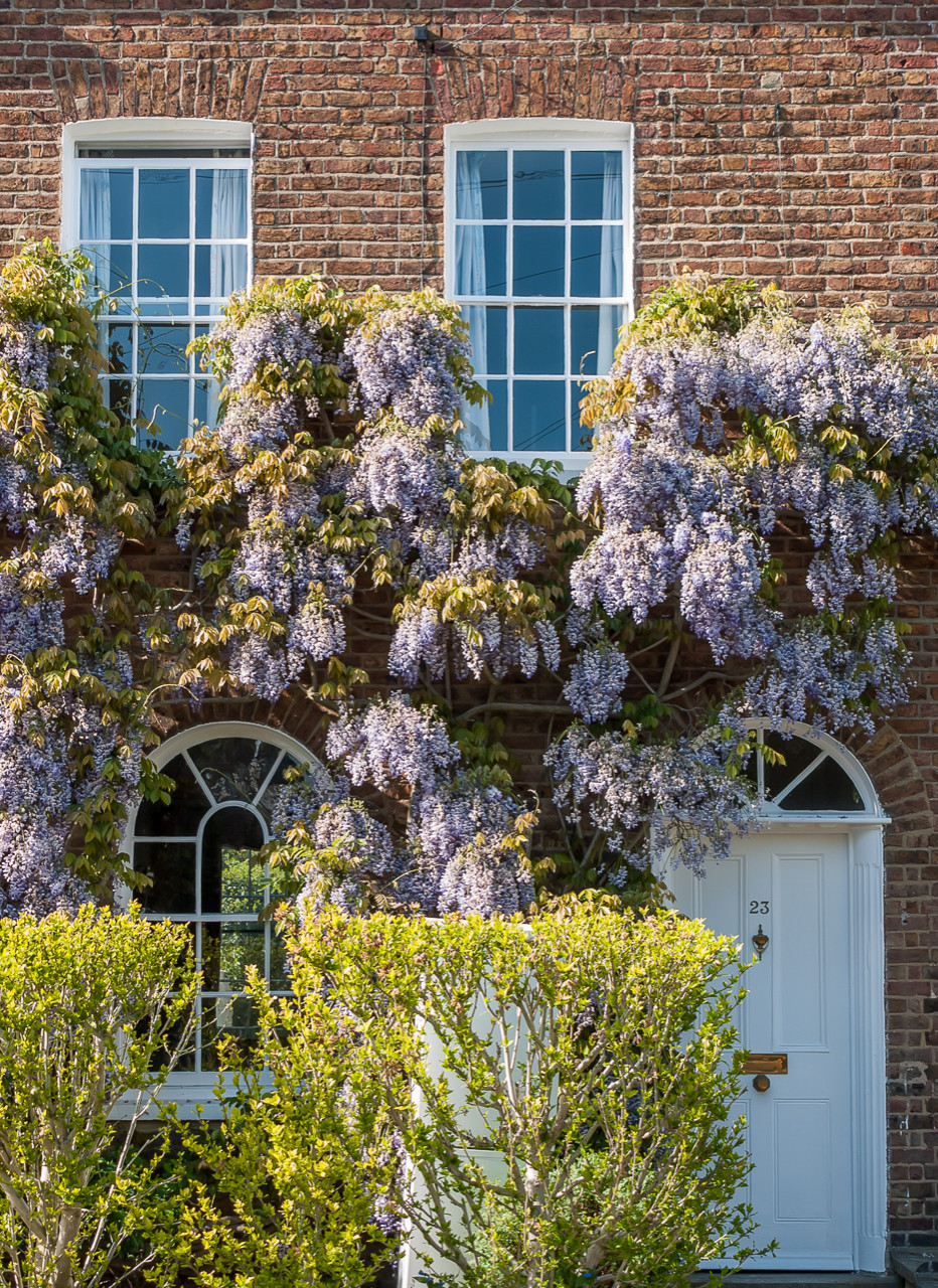 Les fleurs de glycine sont un plaisir pour les yeux, pour le nez et pour les abeilles. La plante protège également les murs extérieurs du vent et des éléments, en hiver comme en été. Quand elle s’invite autour des fenêtres, elle offre une ombre bienfaisante à l’intérieur. Attention : la glycine nécessite un treillis robuste, car elle finit par peser lourd.