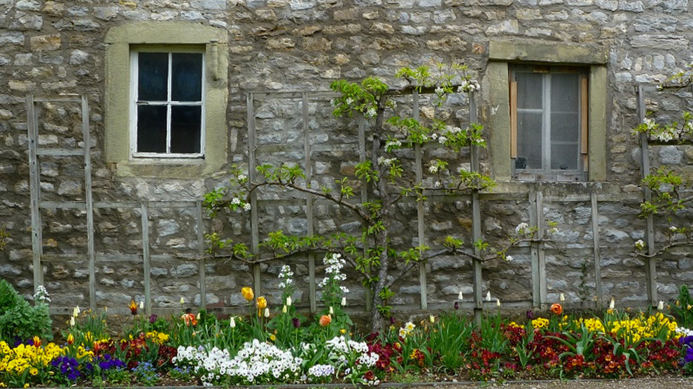 Les façades exposées sud sont parfaites pour les arbres fruitiers. Le soleil les réchauffe d’un côté, quand le mur protège les fruits de l’autre. Poires, pommes, pêches et autres délices poussent, comme les branches, entre soleil et façade. Nos yeux et nos papilles en profitent, nos amies les abeilles aussi !