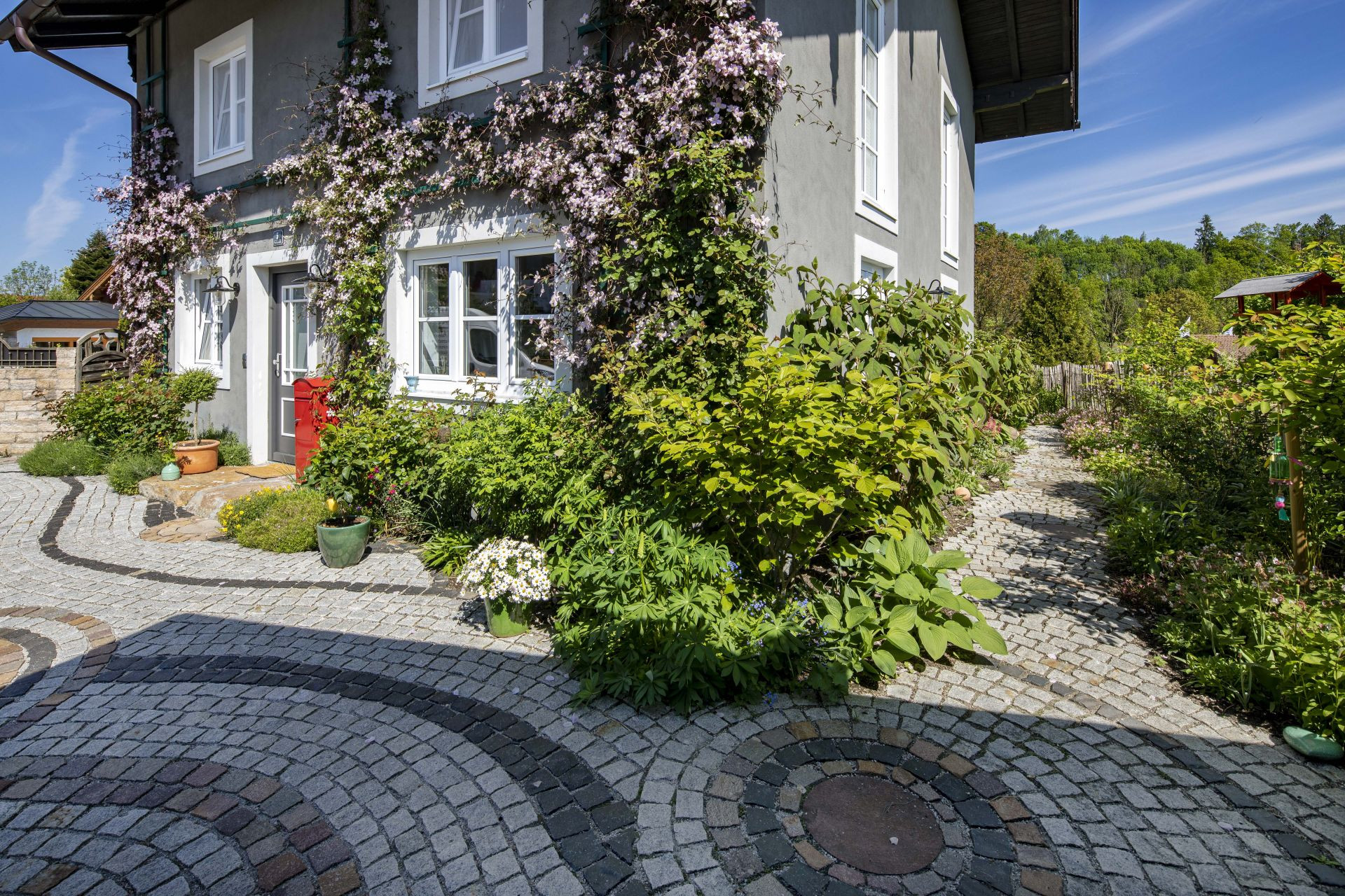 Pour équilibrer et ombrager un espace extérieur pavé, rien de tel que de planter en masse tout autour de la maison. Les surfaces dures stockent la chaleur en journée et la libèrent durant la nuit, ne permettant pas de vraie baisse de température. Avec une végétation soigneusement pensée, bénéficiez d’un peu de frais et protégez votre sous-sol en cas de pluie torrentielle grâce à leur action drainante.