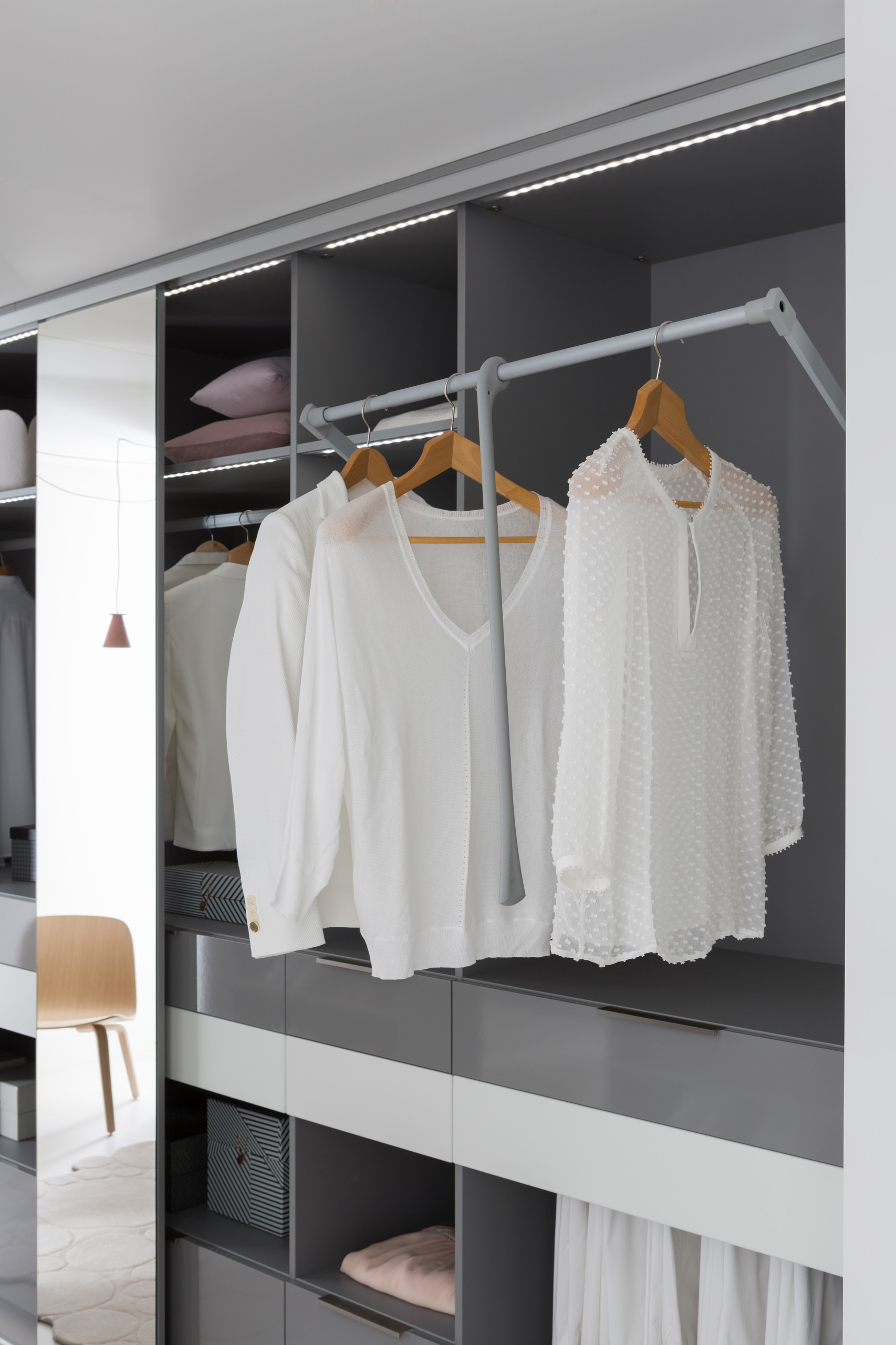 Aujourd’hui la gamme des accessoires disponibles pour les placards à vêtements est très large. Selon les besoins, il est possible d’ajouter des crochets pour suspendre les ceintures, un porte-cravates, des tiroirs compartimentés pour la lingerie, les foulards ou même les bijoux. Parmi nos préférés, il y a la tringle mobile, que l’on peut abaisser grâce à un mécanisme de tirette. Cela permet d’entrevoir des aménagements de placard toute hauteur.