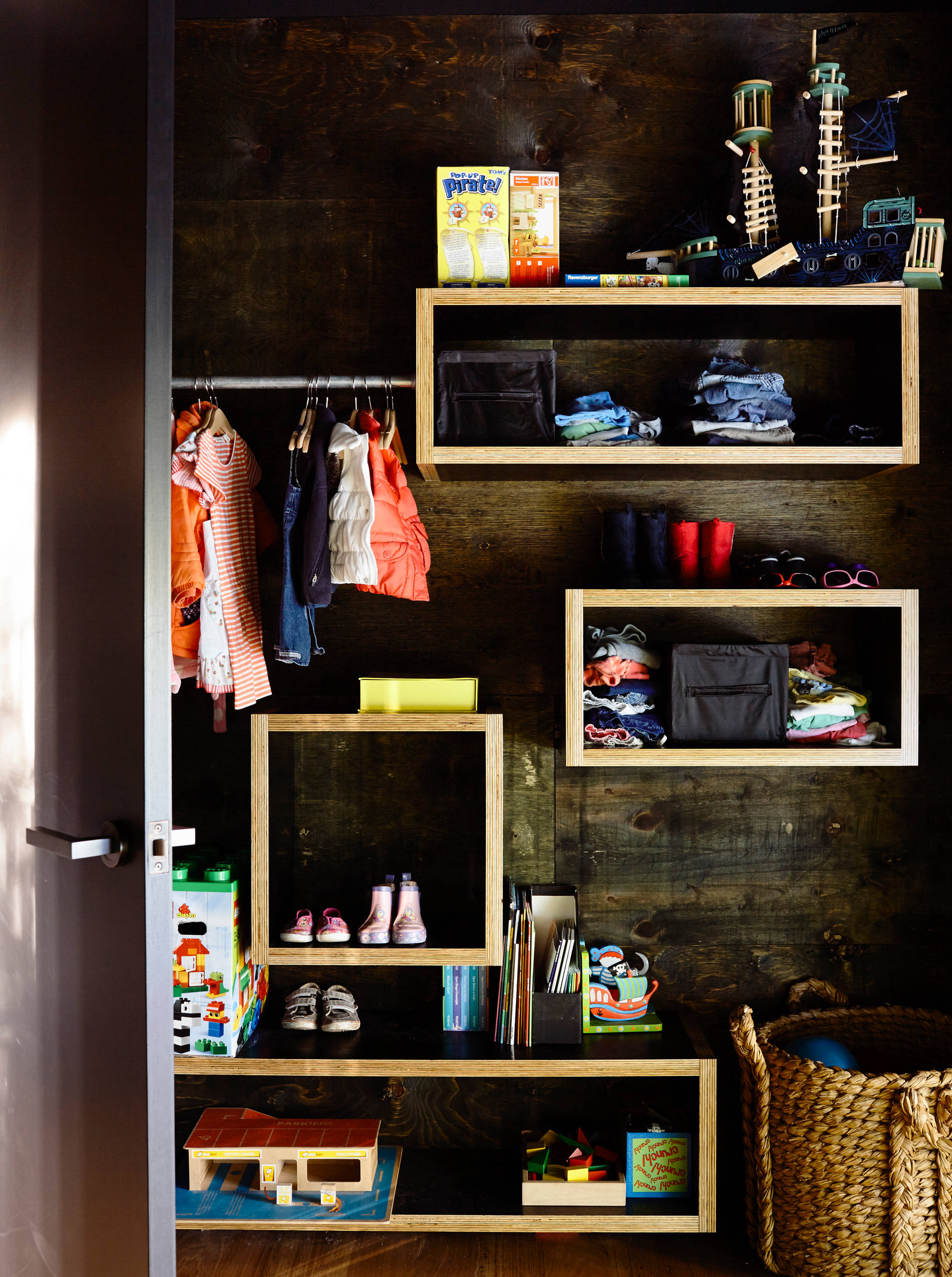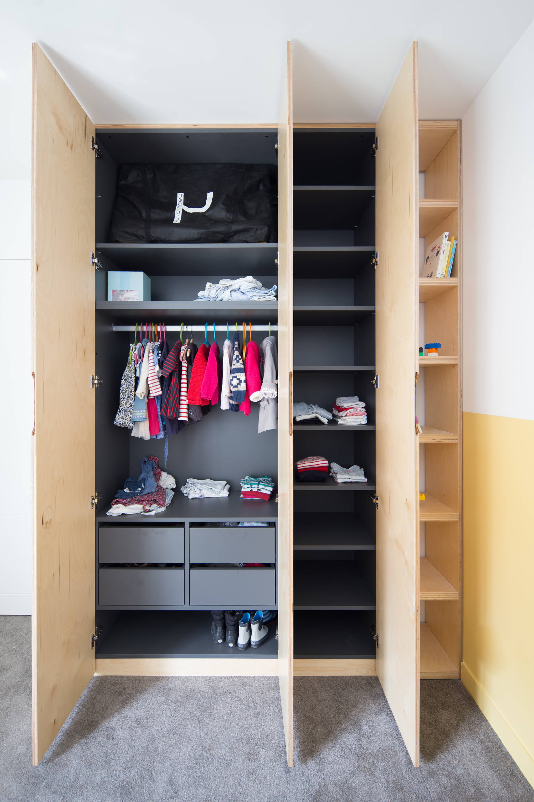 Autre idée pour aménager un placard peu profond dans une chambre d’enfant. Quatre cases de différents gabarits ont été agencées pour créer de jolis rangements qui favoriseront chez l’enfant l’envie de ranger. La penderie n’a pas été oubliée et la tringle a été fixée entre l’un des éléments et la structure du placard.