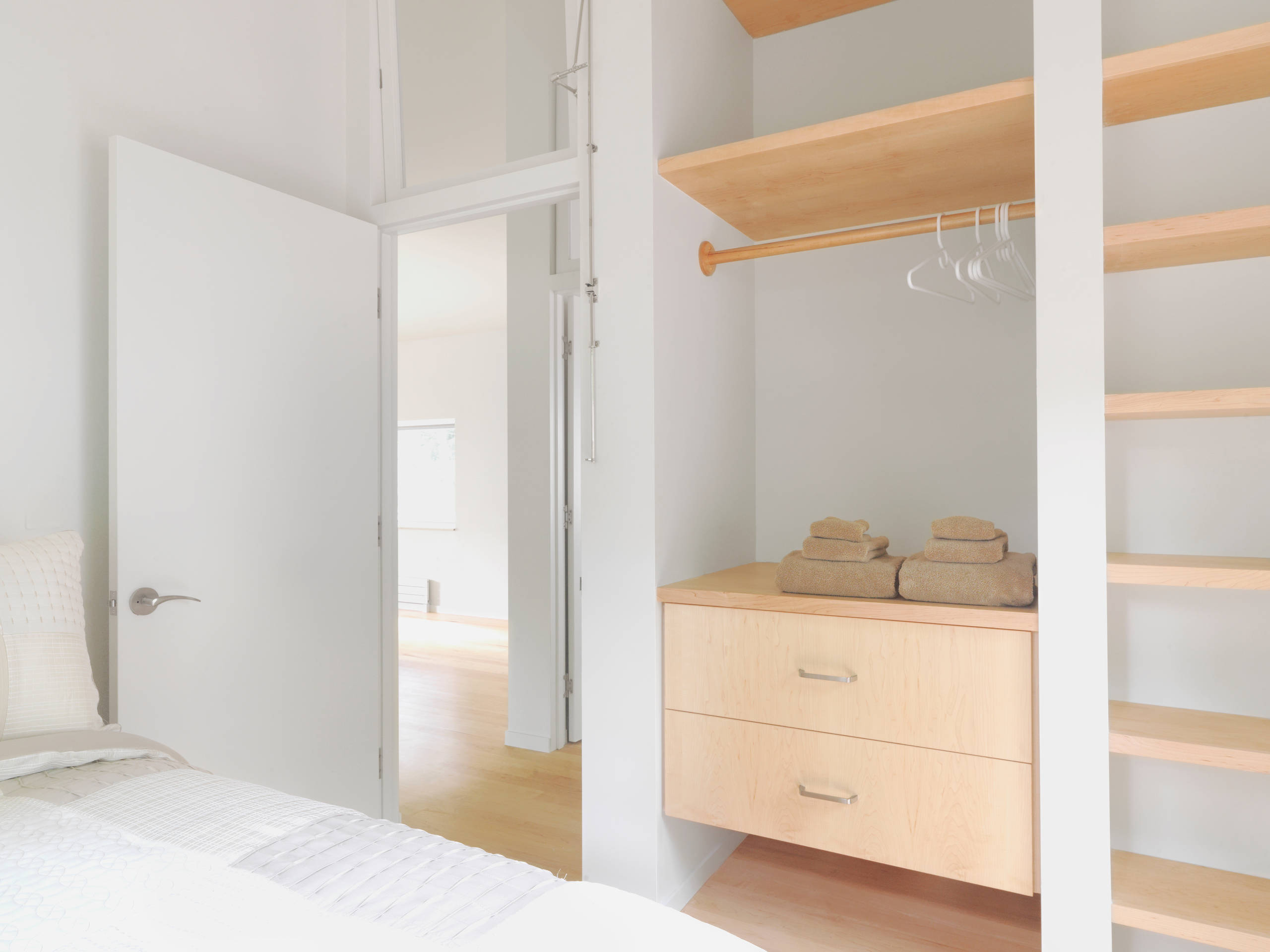 En quête d’idées pour aménager un placard dans une chambre ou une entrée ? Voici une idée d’aménagement ouvert dans un recoin existant qui comporte tout ce qu’il faut. Deux tiroirs miment une commode pour les vêtements pliés ou la lingerie, une tringle crée la penderie et des étagères en partie haute accueilleront les pulls. On apprécie les tiroirs suspendus qui allègent la composition et laissent éventuellement de la place en dessous pour quelques paires de chaussures.