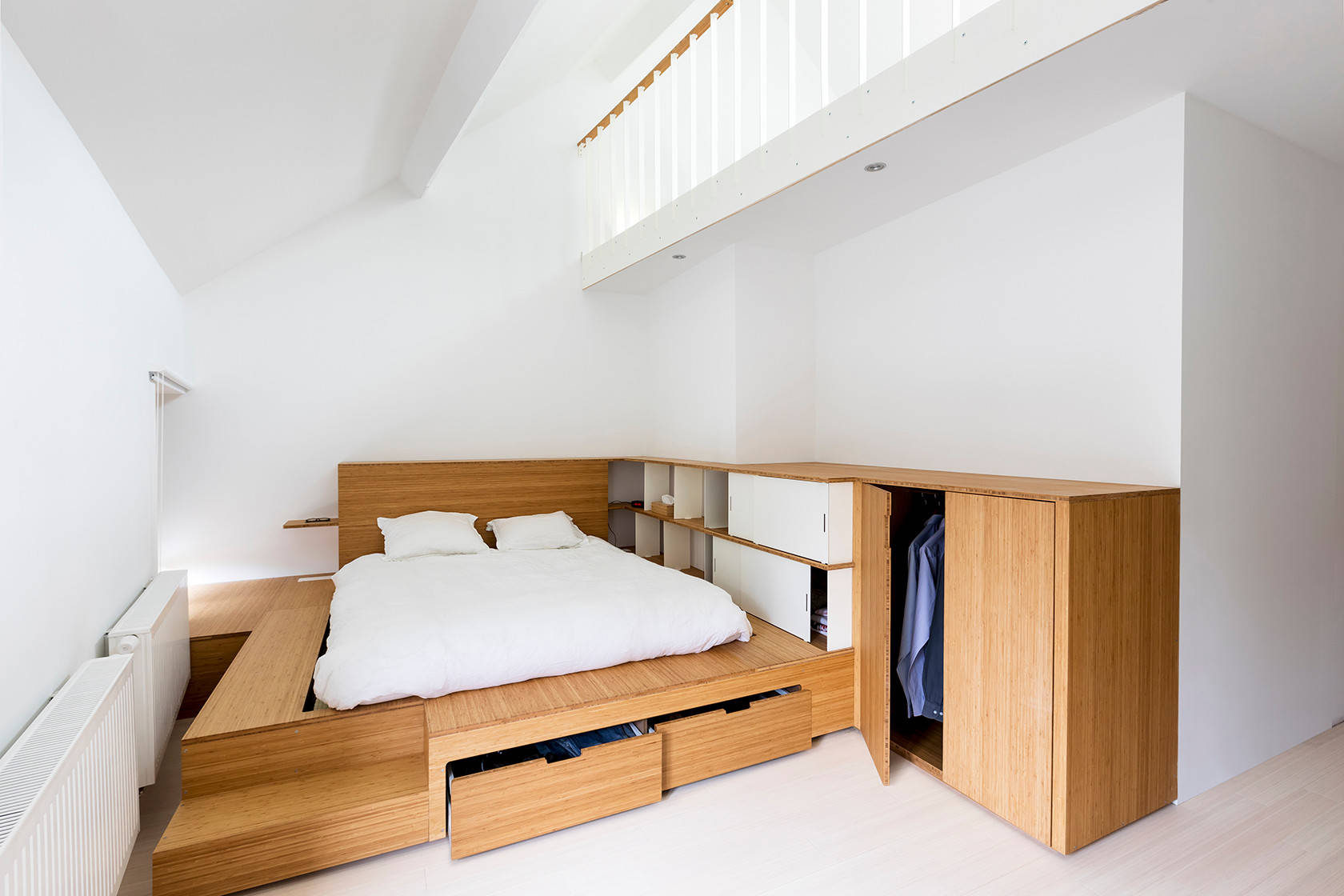 On apprécie cette idée d’aménagement de lit-dressing tout-en-un qui exploite un côté et le dessous du lit pour stocker les vêtements. Outre que cette solution est esthétique et compacte, elle conviendra aussi à toutes les pièces basses de plafond ou aux personnes qui désirent garder tout à hauteur de main. À retenir également pour les chambres d’enfant.