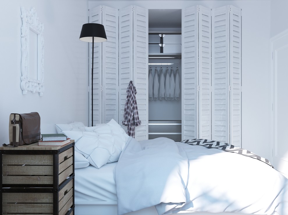 C’est toujours une excellente idée d’aménager un dressing sur un mur de la chambre, en particulier le mur mitoyen car il créera une isolation phonique. Mais les chambres actuelles ne sont pas très grandes, autour de 12 m² si vous avez de la chance, parfois moins. Comme vous le savez, il existe trois types de portes de placard : les portes classiques, pivotantes, sont souvent trop larges pour l’espace. Les portes coulissantes sont assez pénibles à utiliser à deux car elles cachent un pan de placard. Restent les portes pliantes qui divisent en deux la course de la porte sans obstruer toute la circulation le long du lit…