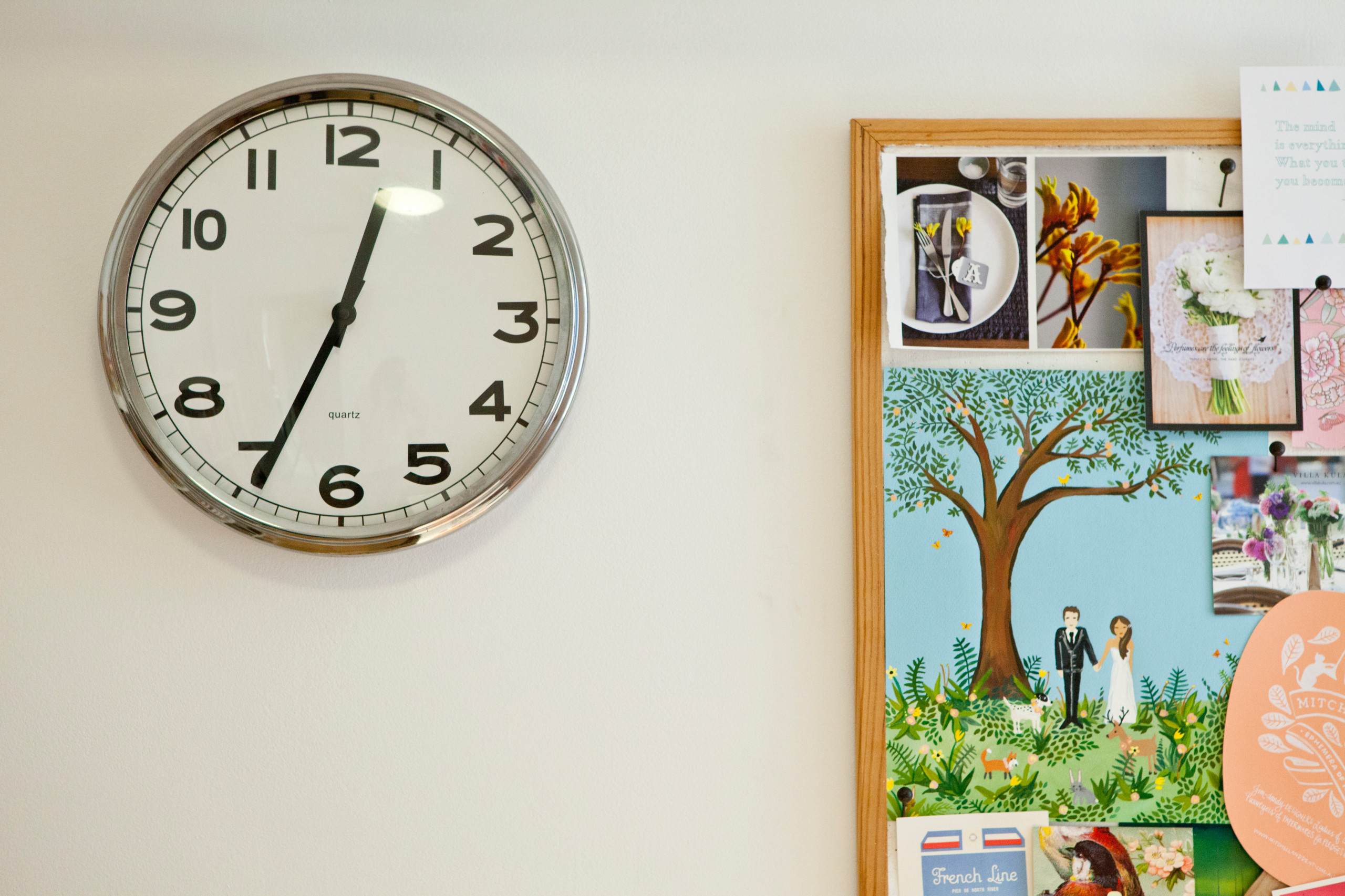 N’oubliez pas d’accrocher une jolie pendule au mur. Elle vous rendra service et décorera votre coin bureau par la même occasion !