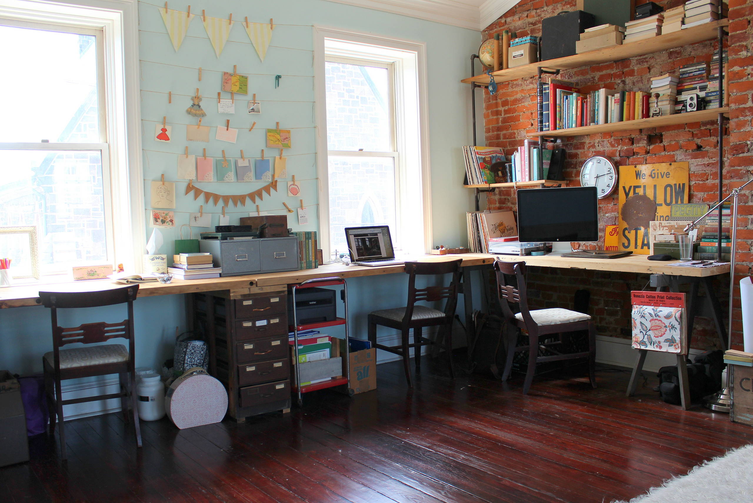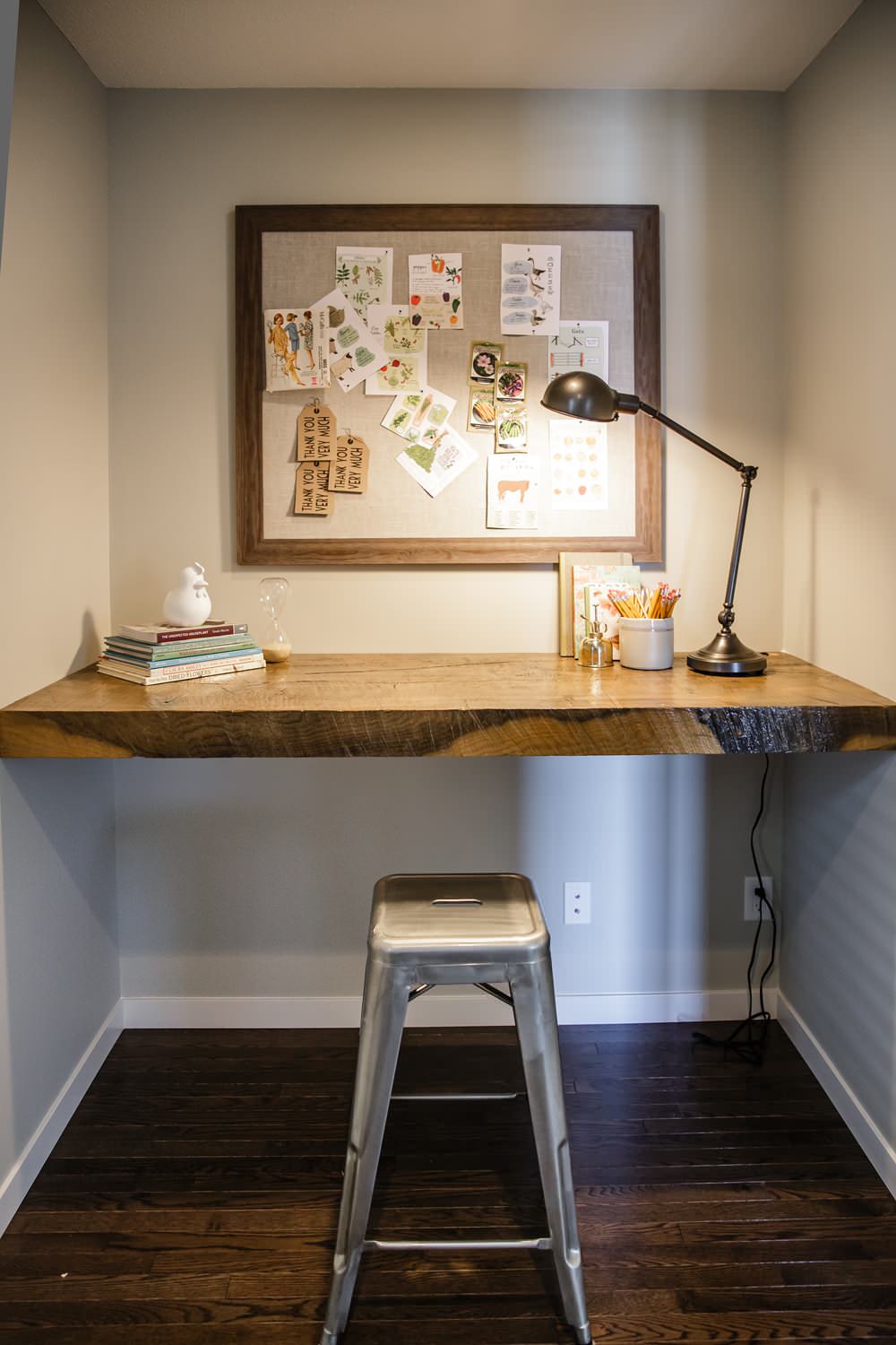 Placée dans un recoin, une seule planche de bois peut vous permettre d’installer un bureau à tout petit prix. Dans ce cas, il est important de prévoir des rangements à côté.