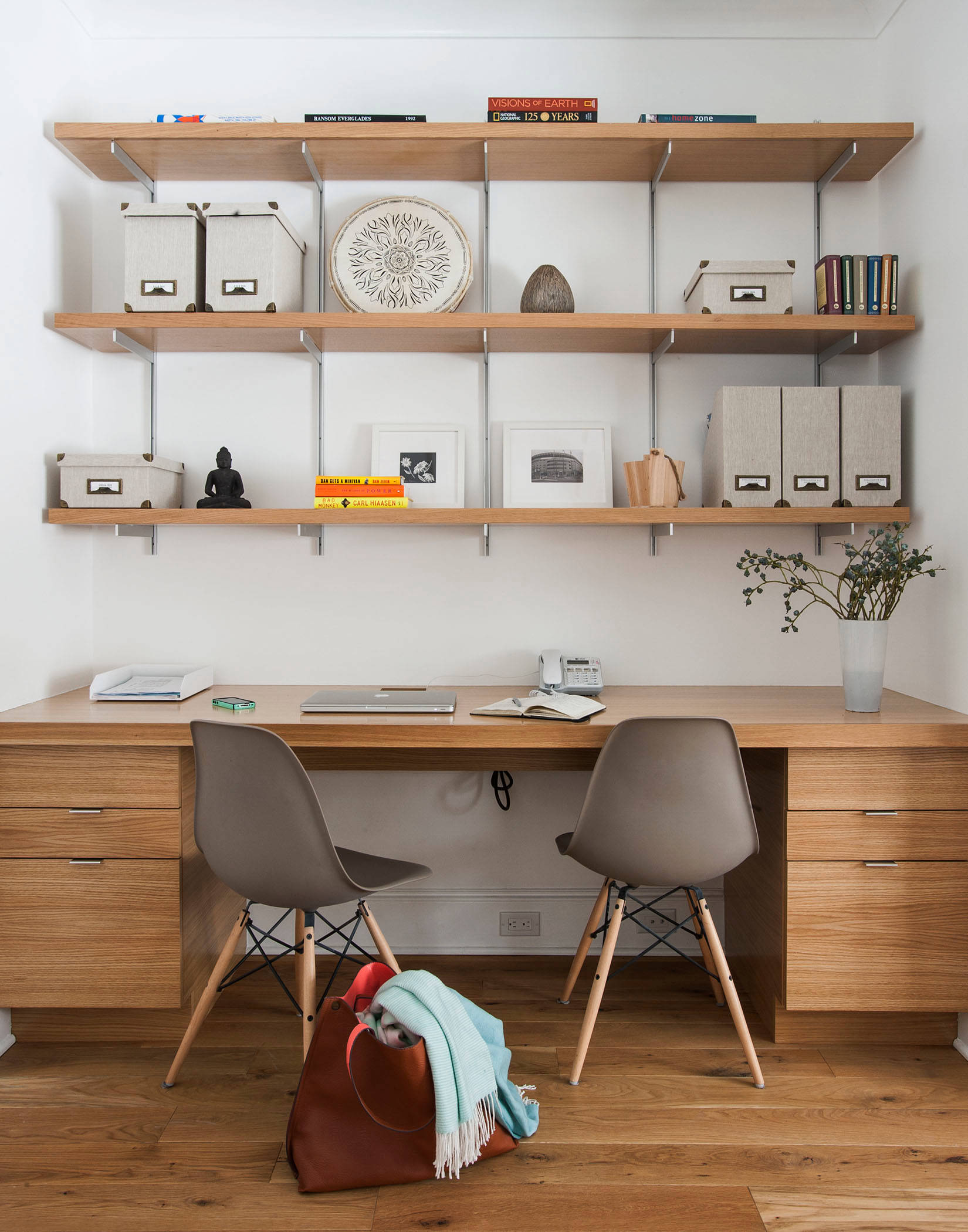 Les étagères murales ne coûtent pas cher et offrent des espaces de rangement pratiques au-dessus du bureau. Tout comme les casiers, vous pouvez les aménager avec des boîtes, afin de ranger et dissimuler vos dossiers, et avec d’autres éléments de décoration comme des cadres photo, des livres ou des figurines.