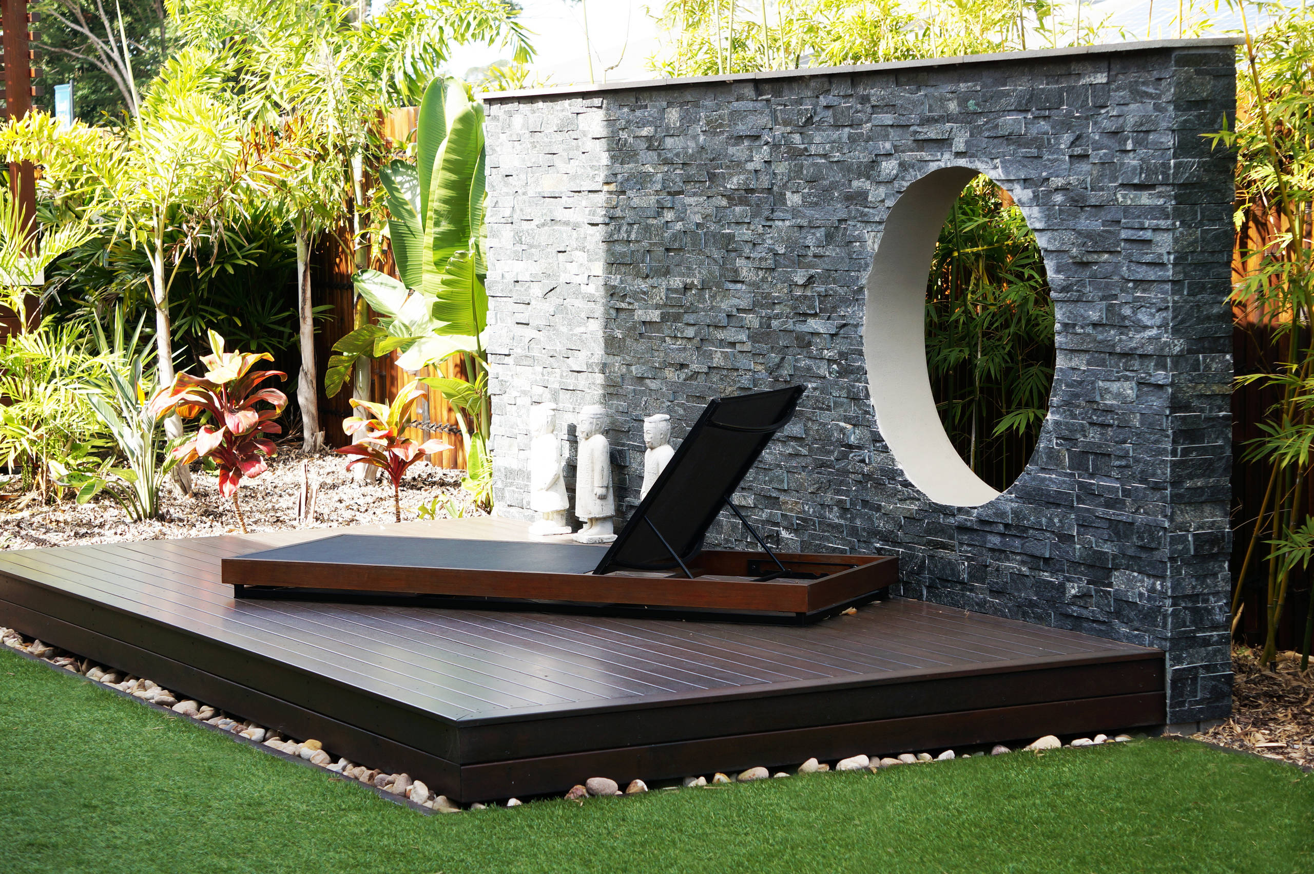Un joli coin zen peut aussi être design. Il accompagne volontiers une maison contemporaine, ou de style industriel ou plus classique. Nul besoin que votre habitat soit en bois. Partout, comme ici, en Australie, on plante le décor : une chaise longue de jardin, couleur d’encre, sur une terrasse en bois exotique, quelques plantes poussant dans la rocaille, des statues japonaises et ce joli mur de pierres transpercé d’une découpe ronde, comme un soleil levant.