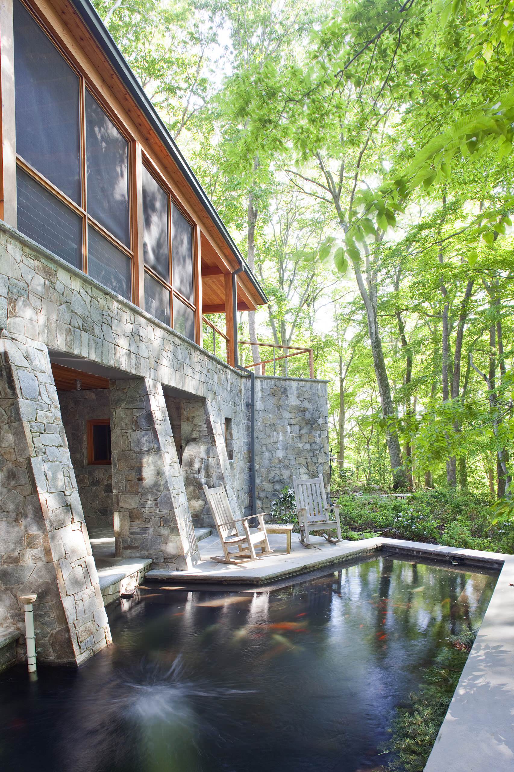 Devant cette résidence en bois et en pierres a été aménagé un étang naturel pour y accueillir quelques carpes koï. Elles animent les eaux de leurs couleurs vives et de leur présence silencieuse. Si votre coin zen vous le permet, invitez-y vous aussi quelques poissons rouges et attirez les oiseaux en leur accrochant une mangeoire en forme de pagode. Par contre, évitez les grenouilles et les frelons asiatiques qui ne laisseront pas votre havre paisible bien longtemps !