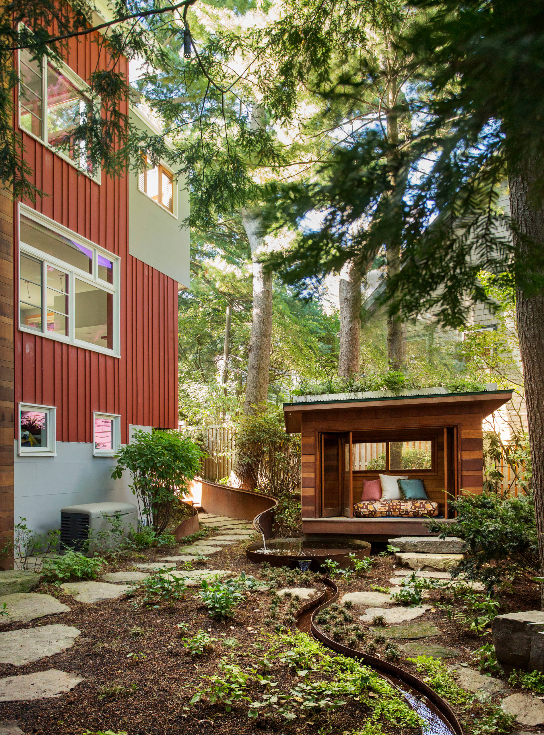 Élément majeur des jardins japonais, cet élément est présent sous toutes ses formes : de la source à la pierre à eau, en passant par le ruisseau, voire la cascade. Ici, une fontaine contemporaine, en Australie, prend une allure japonisante par l’apport de pierres disposées tout autour du bassin, de buis taillés en boules, mais aussi par un joli jeu de lumière, notamment un arbuste éclairé en rouge. Un lieu magique pour voir les oiseaux se désaltérer et couvrir les bruits de la ville !