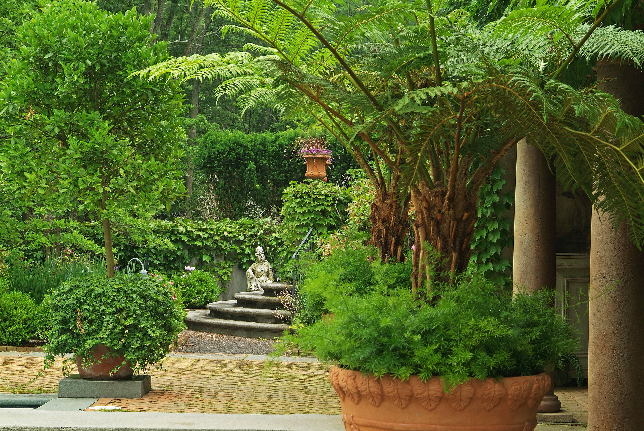 Ici, les palmiers en pot remplacent les fougères, le dallage, les pas japonais, les vignes, les bambous ou les thuyas. La tonnelle est en béton, tout comme les colonnes arrondies, et une vasque détrône la lanterne. Et pourtant, ce jardin très foisonnant mais peu fleuri, sans symétrie ni linéarité, évoque aussi les bases d’un jardin japonais !