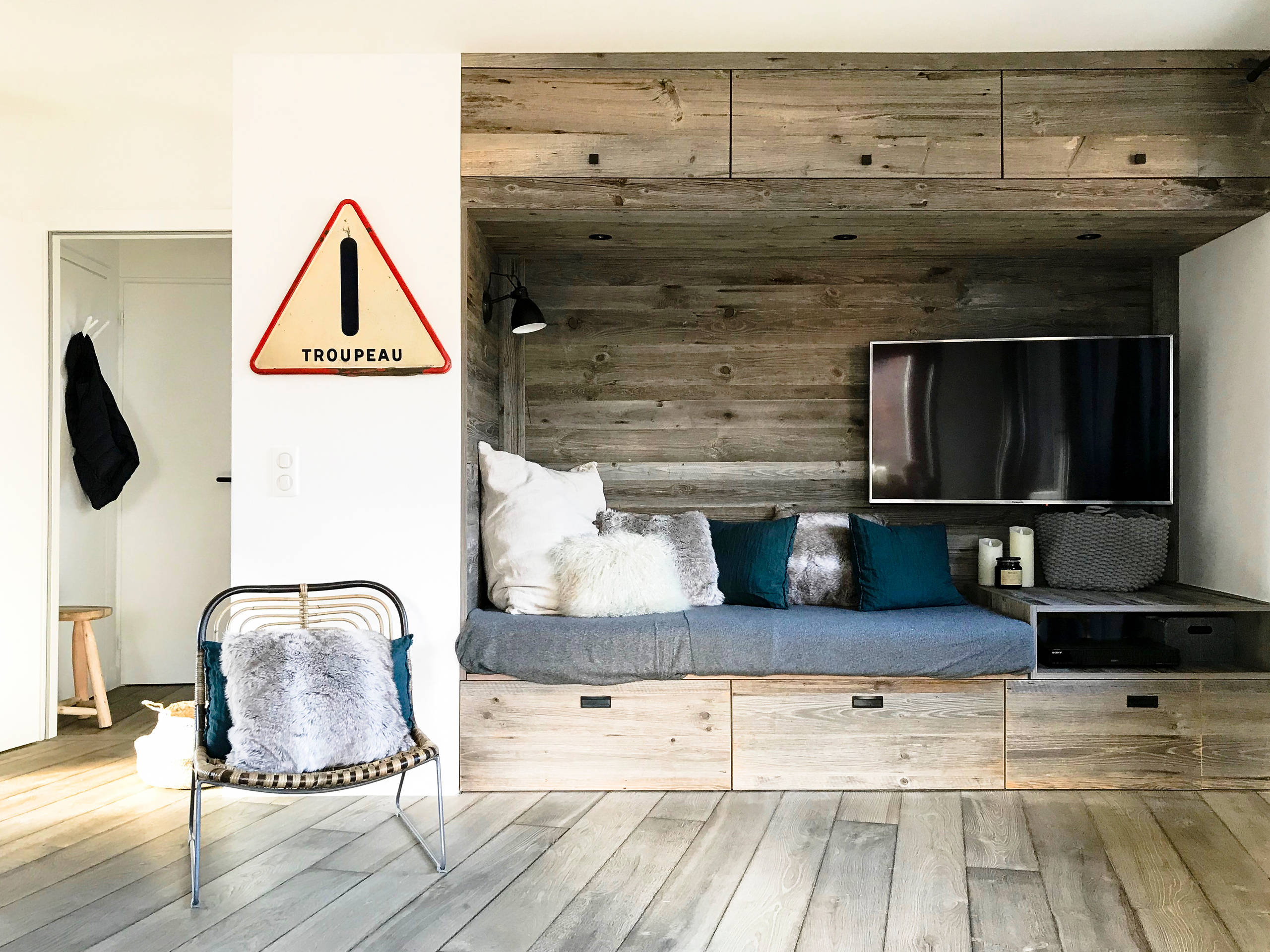 Vous disposez d’un petit espace et d’une grande envie d’une ambiance chalet ? Inspirez-vous de ce duplex de Méribel qui, avec quelques idées ingénieuses, signe une jolie ambiance montagnarde ! Une banquette encastrée et parée de boiseries grisées rappelle une halte dans un gite de haute altitude. Quelques plaids ou coussins en fausse fourrure, blanche à beige, ici ou là vous donneront envie de vous y lover tout l’hiver. Et si vous n’avez pas de vue sur la montagne, des photographies feront illusion !