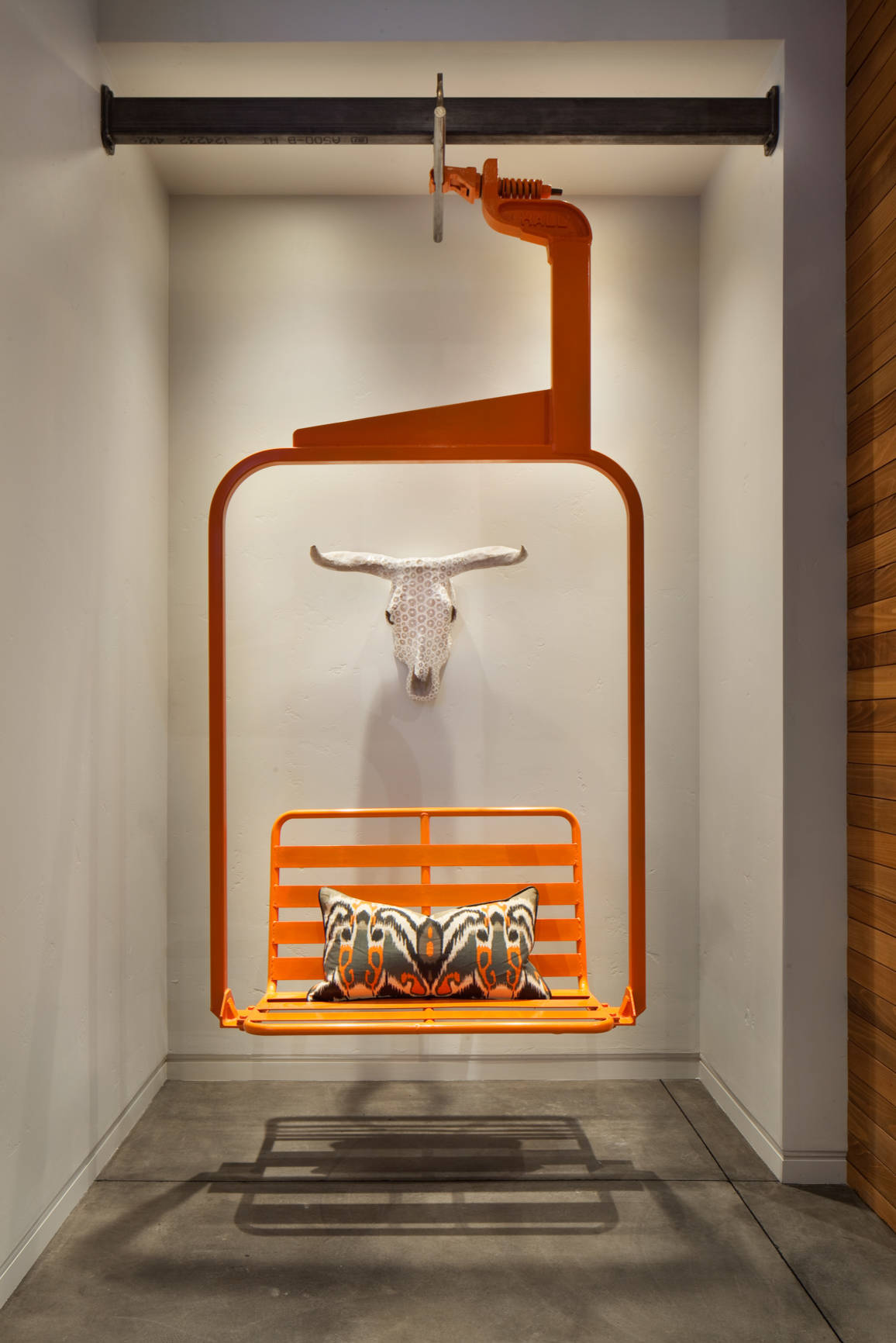 De l’autre côté de l’Atlantique, c’est un véritable télésiège qui a été intégré dans la déco d’un chalet ! En métal orange, il se balance au fond d’un couloir. L’installation d’une poutre métallique est cependant nécessaire pour rêver de rejoindre les cimes sans dégringoler avec !