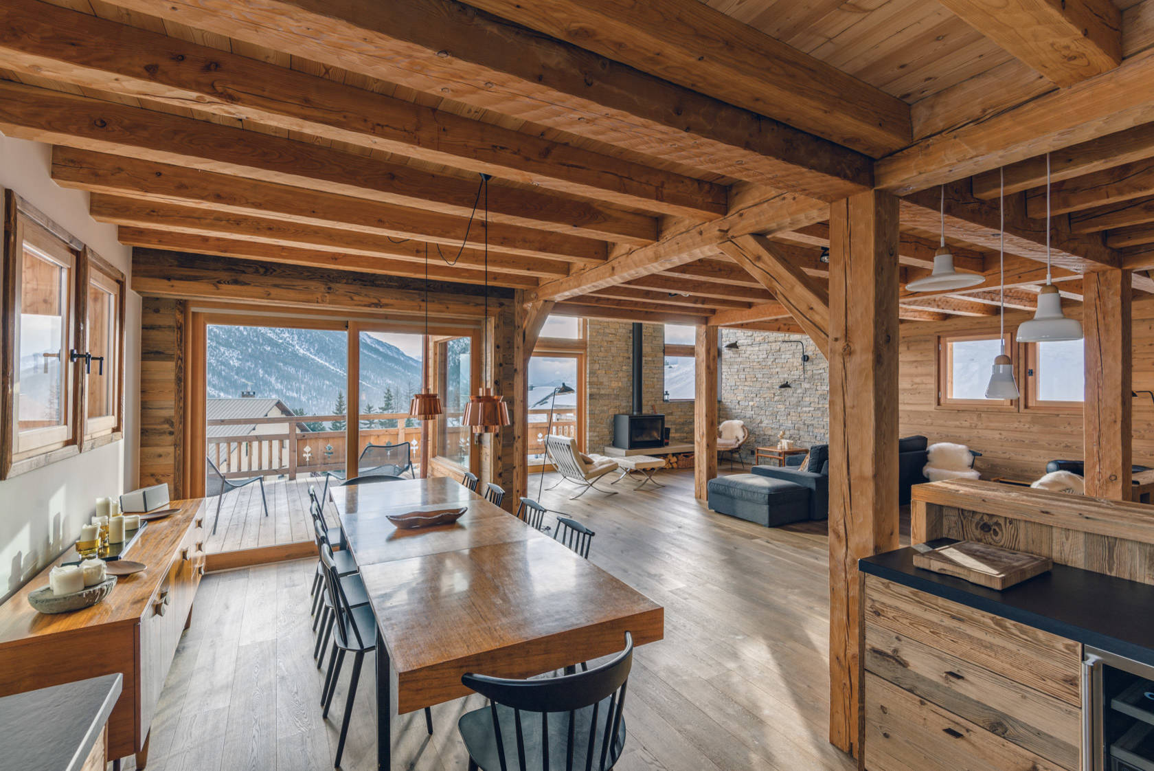 Lorsqu’on a la chance de posséder un grand espace inondé de lumière, on la laisse circuler. Ne conservez que les poutres et les montants, murs porteurs de votre chalet… ou de votre maison de campagne ou loft à transformer en style chalet ! Faites ressurgir les encadrements de portes en bois. Ajoutez un parement en bois sur certains murs pour offrir une perspective digne des alpages. Pour le reste de la déco, restez minimaliste : quelques tapis tissés, des soliflores, des suspensions en cuivre, des meubles fonctionnels. Et pourquoi pas de petites pierres empilées sur les coins de marches, pour symboliser un cairn ?