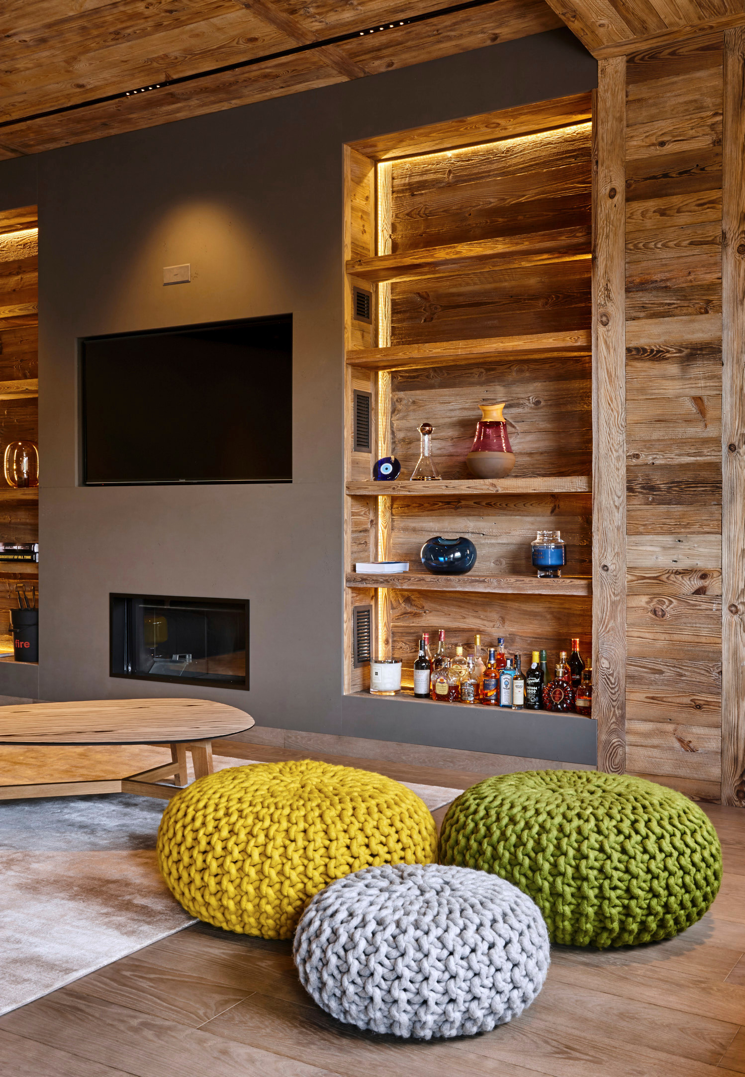 Bien entendu, l’idéal d’une ambiance chalet se trouve au coin du feu ! Pour entourer votre cheminée, vous aurez le choix entre plusieurs options. Si vous avez la place, investissez dans de vastes canapés pour accueillir tous vos convives, comme dans ce chalet de Combloux, en Haute Savoie : un choix soft en gris uni pour souligner la douceur et le caractère. Dans un plus petit espace, optez pour des meubles qui se déplacent : des poufs tricotés ou des tables rondins de bois, comme dans cet autre appartement des Alpes. Autre idée à retenir : remplacez les armoires par des étagères en vieux bois !