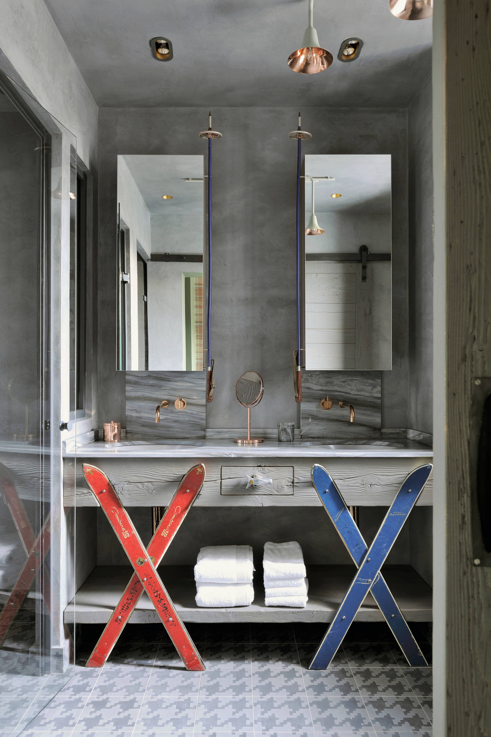 Direction Courchevel pour cette chambre de rêve ! Si tous les efforts étaient auparavant concentrés sur le lit, avec des matières douces et chaleureuses, aujourd’hui, les têtes de lit s’habillent pour faire une ode à la nature hivernale. La salle de bains joue également l’éclectisme avec des « backsplash » marbrés que semblent soutenir de vieux skis en bois recyclés. Le bois a quasiment disparu ou est tout simplement peint en gris, mais l’esprit montagne demeure.