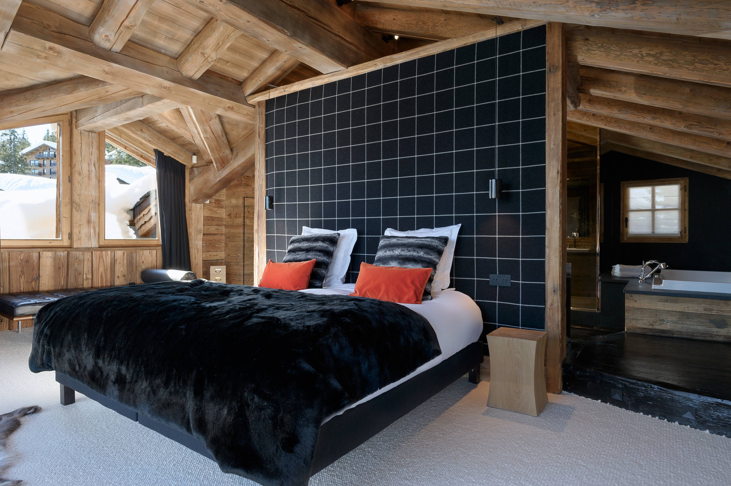 Dans cette chambre à coucher contemporaine, le joli bois de mélèze demeure en tête et en toit de lit, auxquels s’ajoutent deux chevets rondins, mais il est accompagné d’autres matériaux plus contemporains comme le ciment brut. Un soin tout particulier est apporté aux textiles : rideau occultant en laine et linge de lit pied de poule. Les carreaux noir et blanc s’associent aux motifs géométriques actuels et se détachent sur des draps blancs rappelant les neiges éternelles. Quant à l’éclairage, il est tamisé, comme il se doit dans une vraie ambiance chalet !