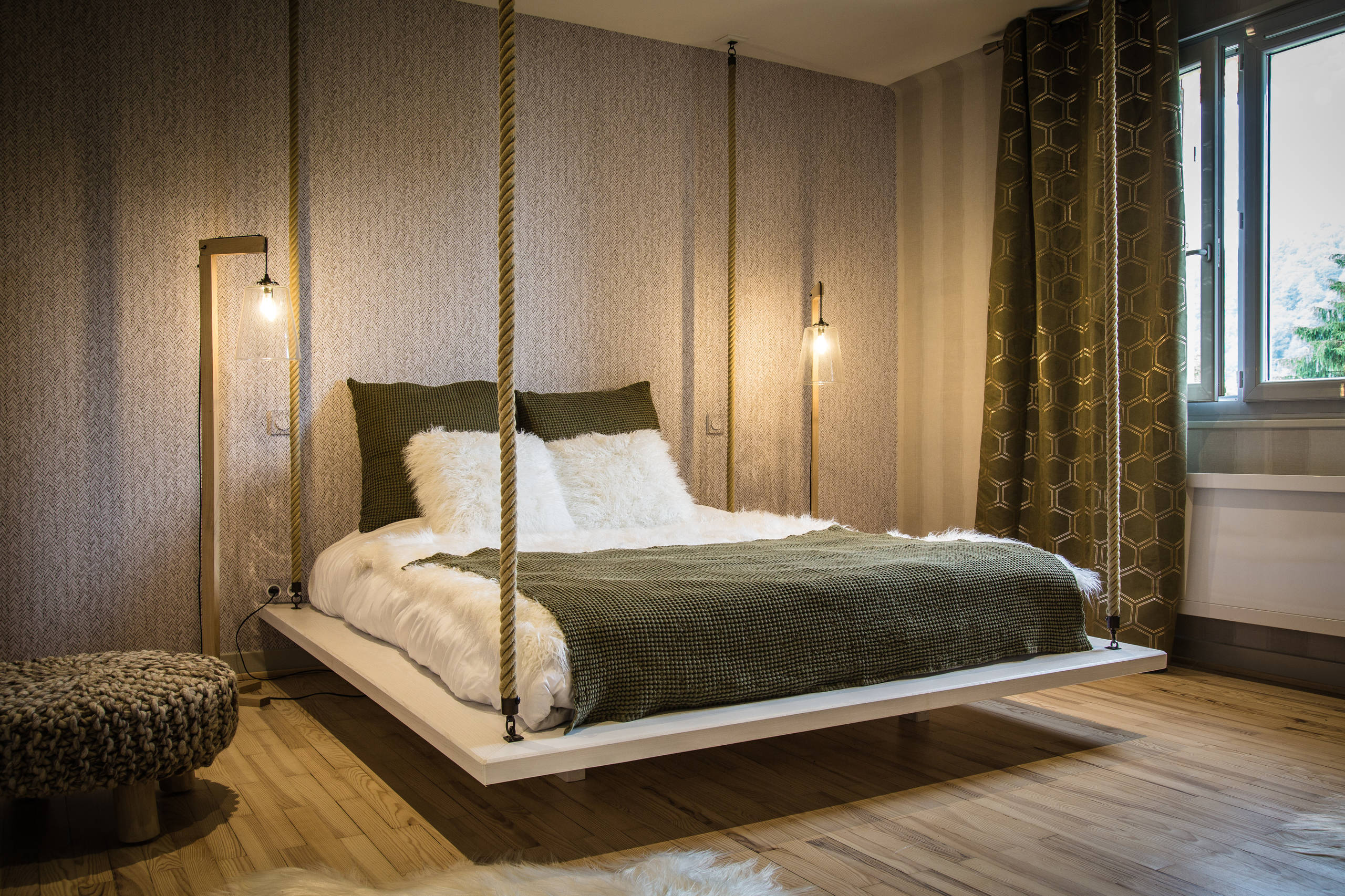 Pour changer des lits superposés, se débarrasser du rouge et des carreaux, on adopte le vert sapin ou le kaki et on joue sur les textures et les motifs géométriques originaux. Mais pas seulement… Dans cette chambre jurassienne, près du lac de Chambly, le lit est suspendu par de grandes cordes solidement ancrées dans le plafond.