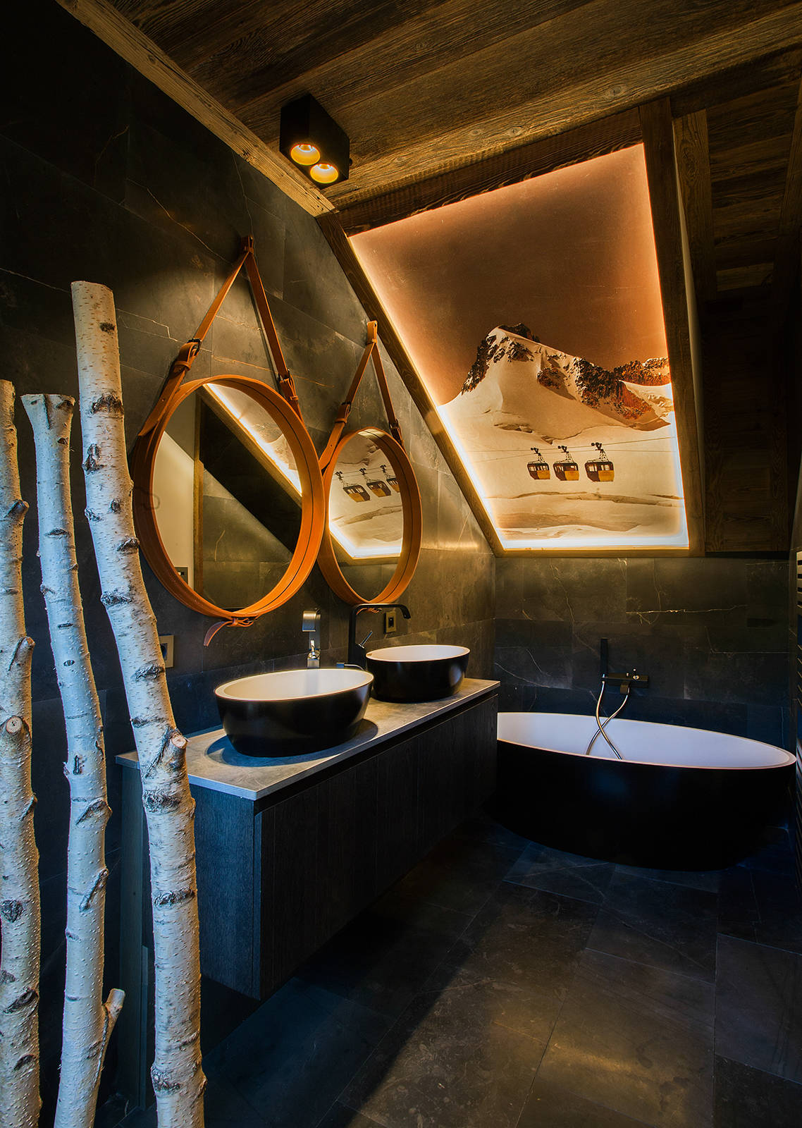 Dans la salle de bains, plusieurs idées lumineuses s’additionnent : les branches de bois naturel encadrent des miroirs ronds Art déco, un poster rétro de téléphériques s’illumine de LED et apporte une perspective, le carrelage noir contraste avec le bois de charpente.