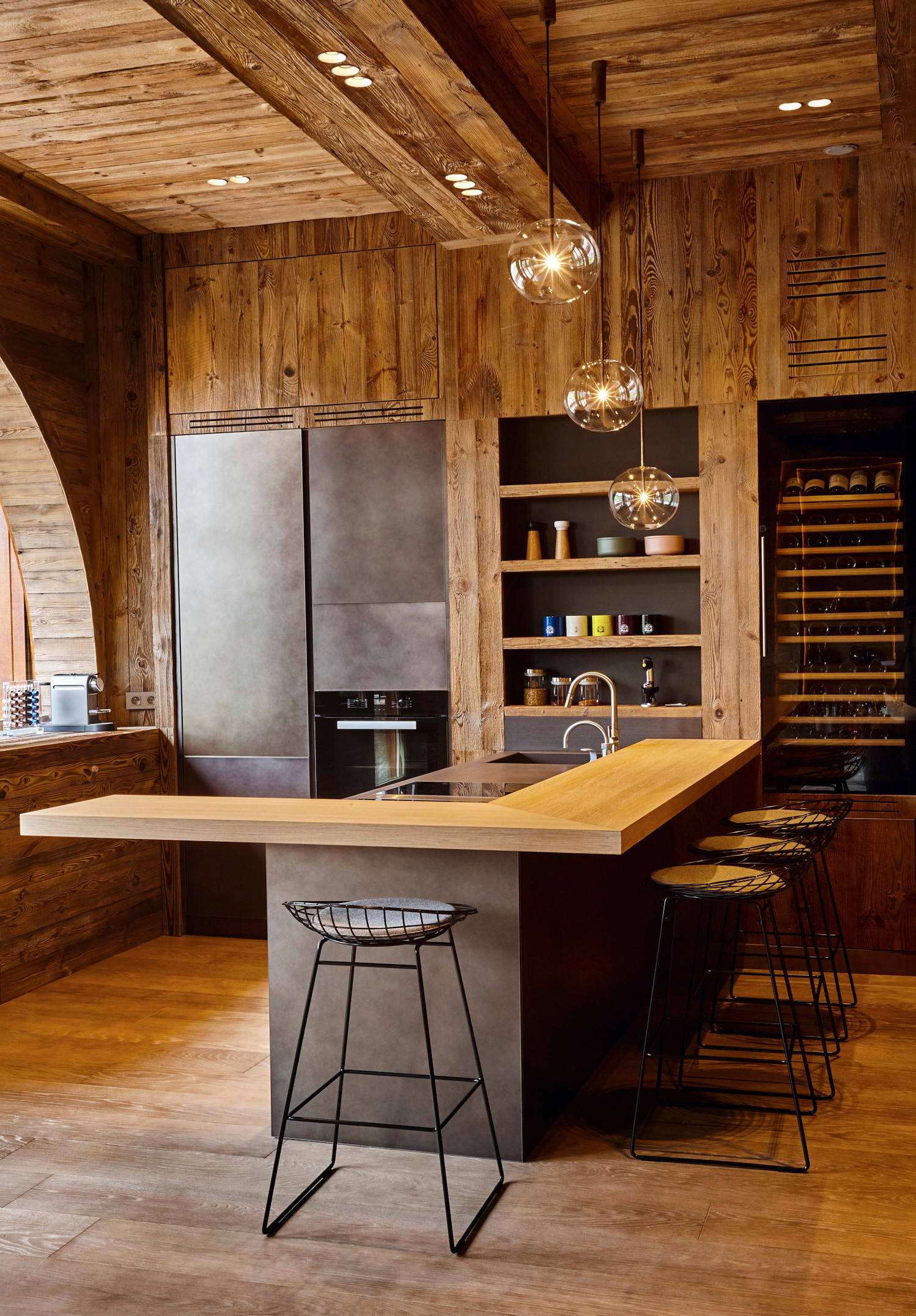 Le bois est incontournable pour une ambiance chalet, y compris dans une cuisine. Donc n’hésitez pas à revêtir vos murs de lames de bois ! Exit la longue table et ses bancs sculptés : aujourd’hui, on opte pour un plateau bar en angle et des tabourets filaires design. Enfin, les luminaires suspendus ne sont plus des bois de cerf mais des globes, en verre par exemple, pour apporter de la légèreté à l’espace.