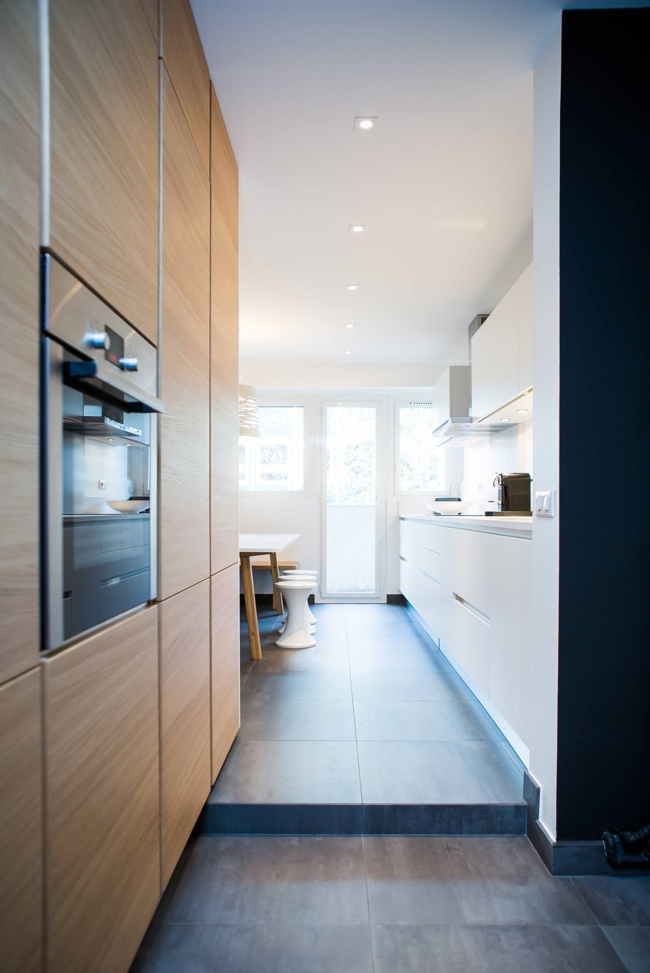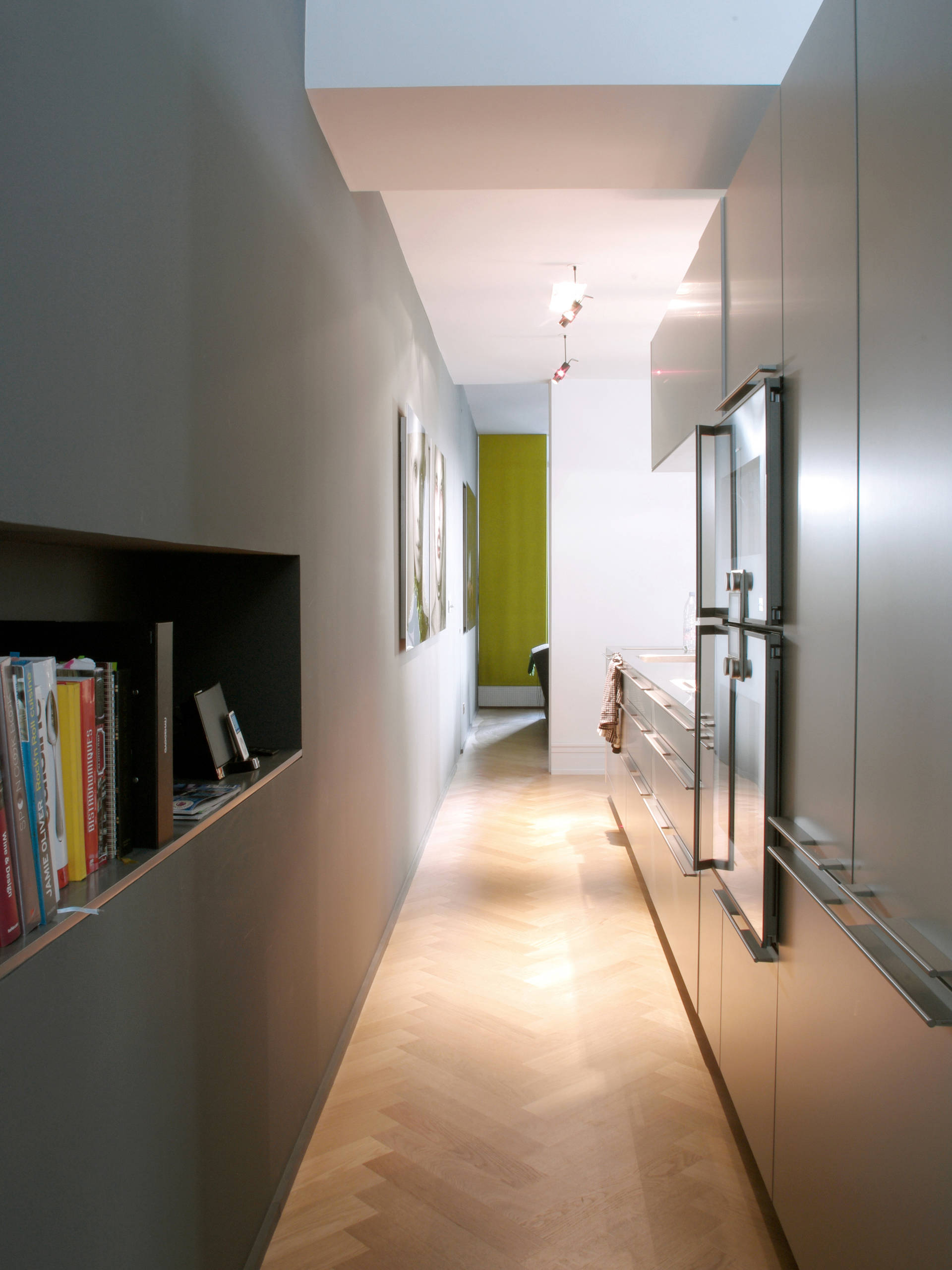 Dans les cuisines « couloir », il est astucieux d’accentuer la linéarité (plutôt que d’essayer le contraire) en travaillant sur les jeux de perspectives de l’espace. Comme ici, par exemple, avec ces deux murs noir mat et les poignées à l’horizontal qui accentuent les lignes. Le parquet posé à bâtons rompus anime l’ensemble.