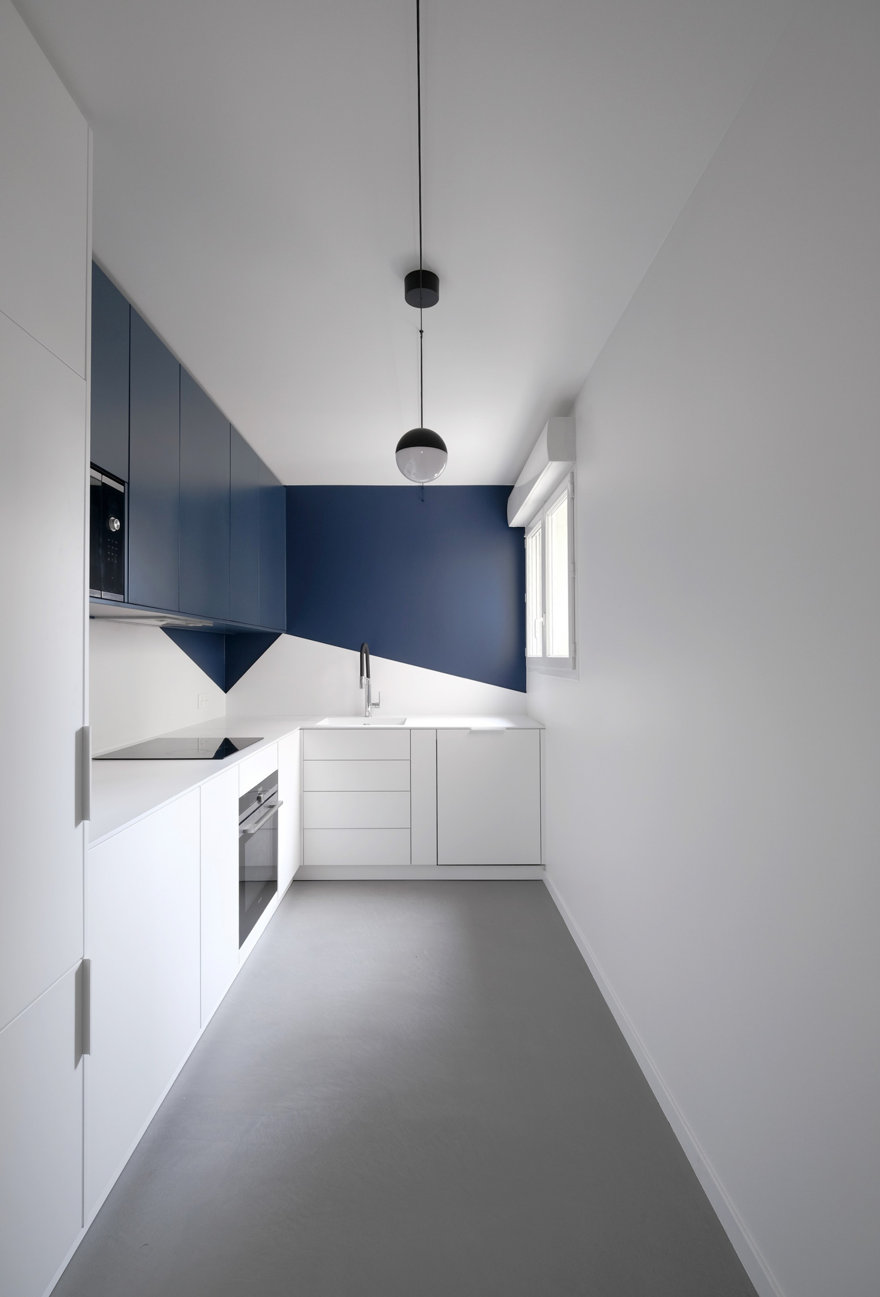 Notez la délimitation de l’orange qui évite soigneusement les moulures des contours et donc l’effet « boîte », incompatible avec une petite cuisine en longueur.
