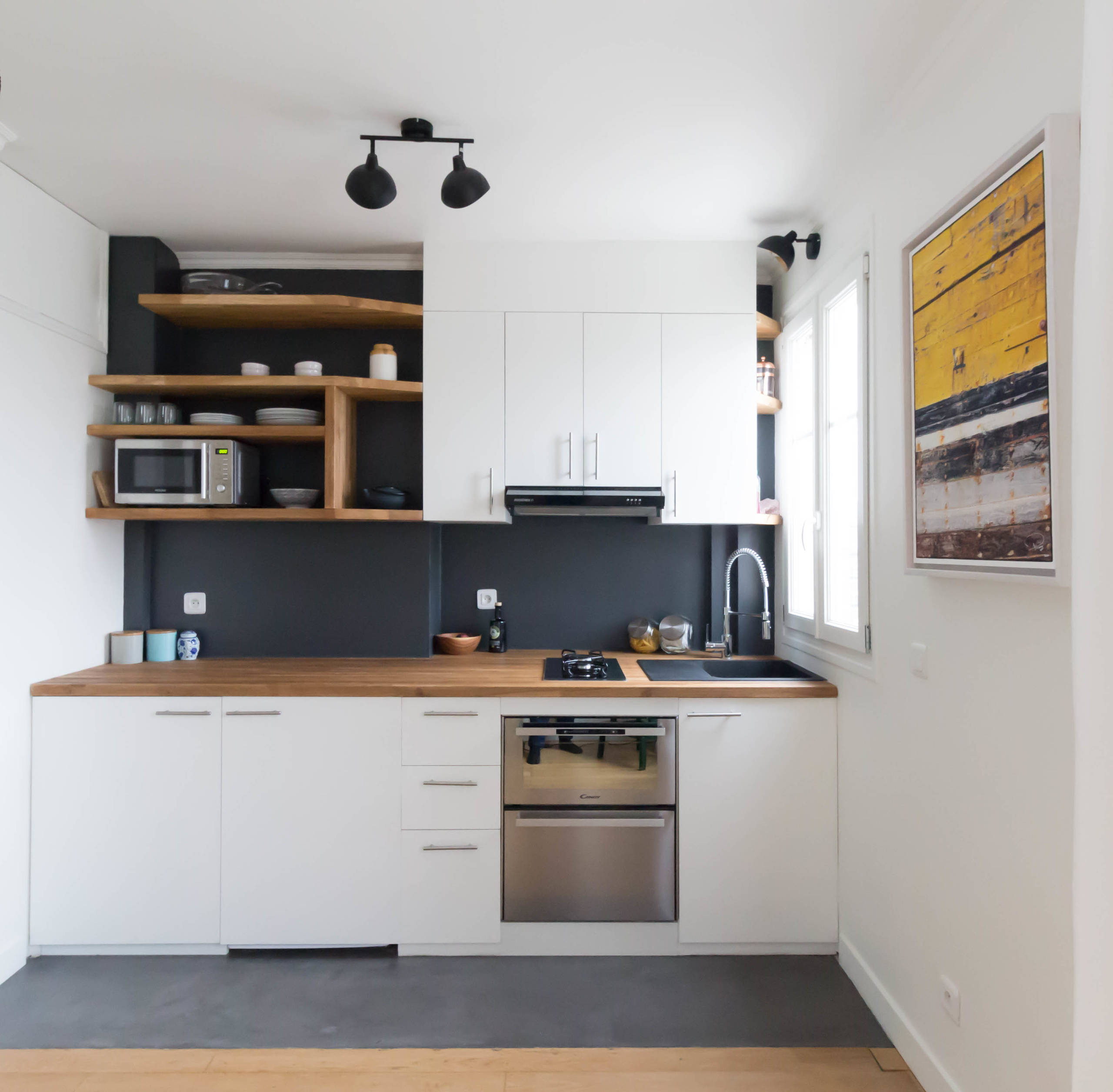Le linéaire de 120 cm de ce mini-loft aménagé à Vincennes par Margaux Carnavelli de l’agence Neva Architecture Intérieure n’aurait pas pu être mieux optimisé. La solution salvatrice est un combiné four/lave-vaisselle placé sous la plaque de cuisson. « Le module double four/lave-vaisselle est un Candy. C’est l’unique marque à faire un duo encastrable sous plan », précise Margaux. À savoir, la marque Rosières dispose d’un combiné équivalent à poser. Une solution géniale qui sauvera la vie de bien des possesseurs de petites cuisines.