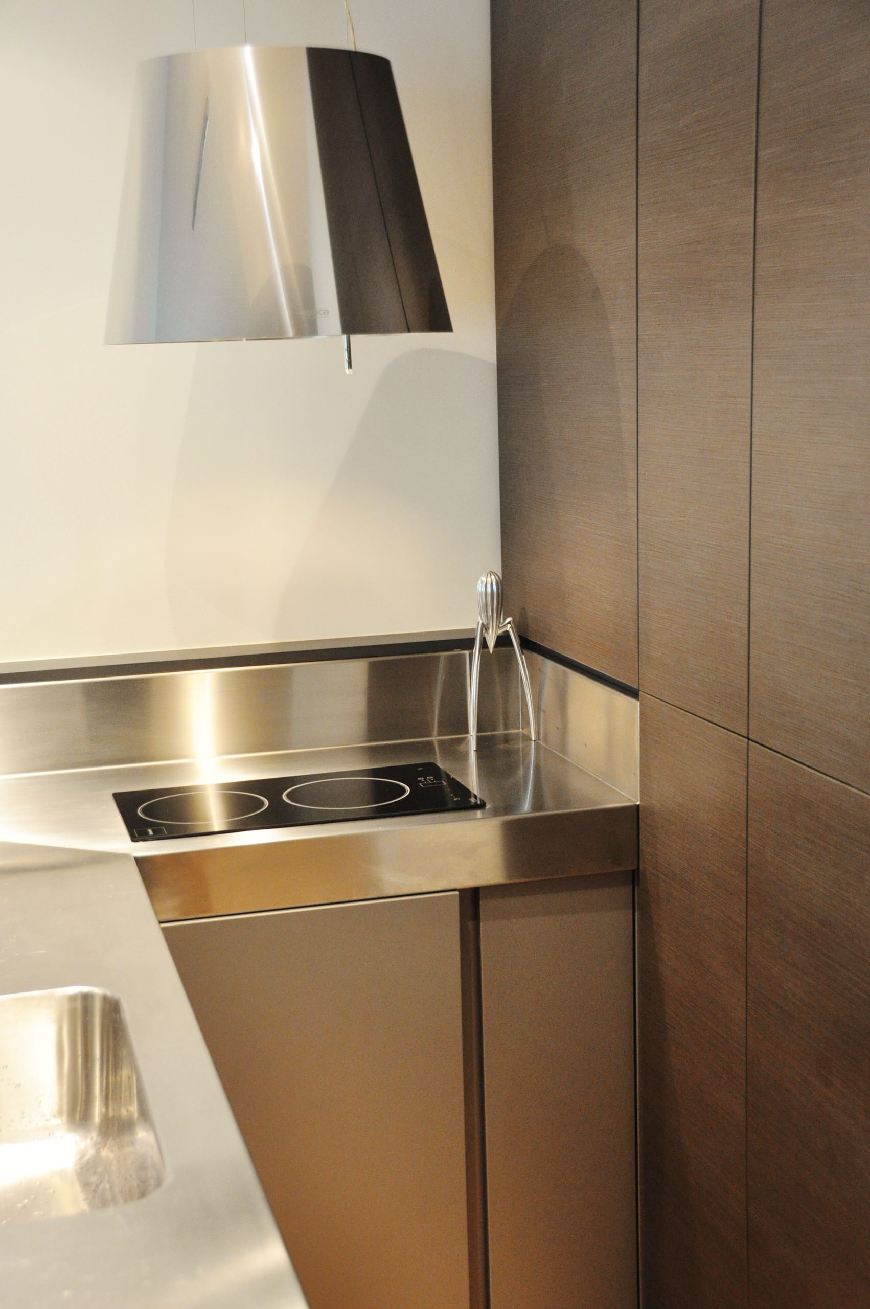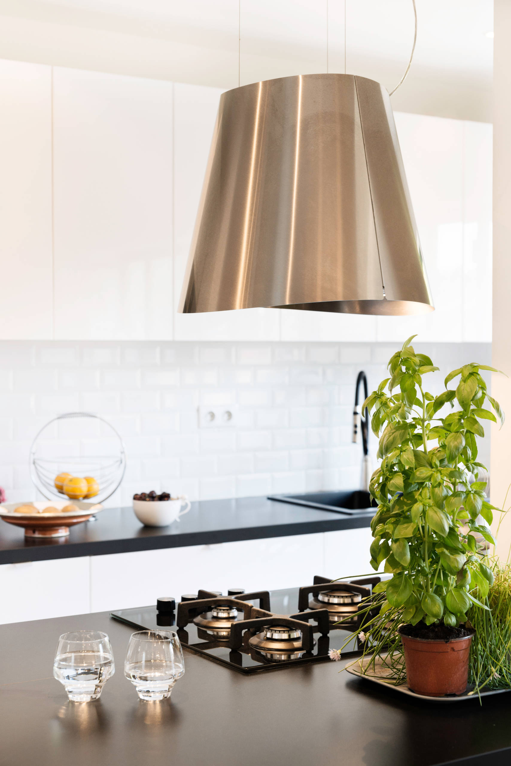 Quand il est nécessaire de placer en position îlot une hotte à filtre efficace, couplée à un éclairage, et qu’en prime on cherche une solution esthétique, le choix se fait rare. L’agence d’architecture d’intérieur Terre de Brume a opté pour ce modèle lustre efficace dans une cuisine équipée à Angers. Il est disponible en finition Inox brossé ou laqué noir ou blanc.
