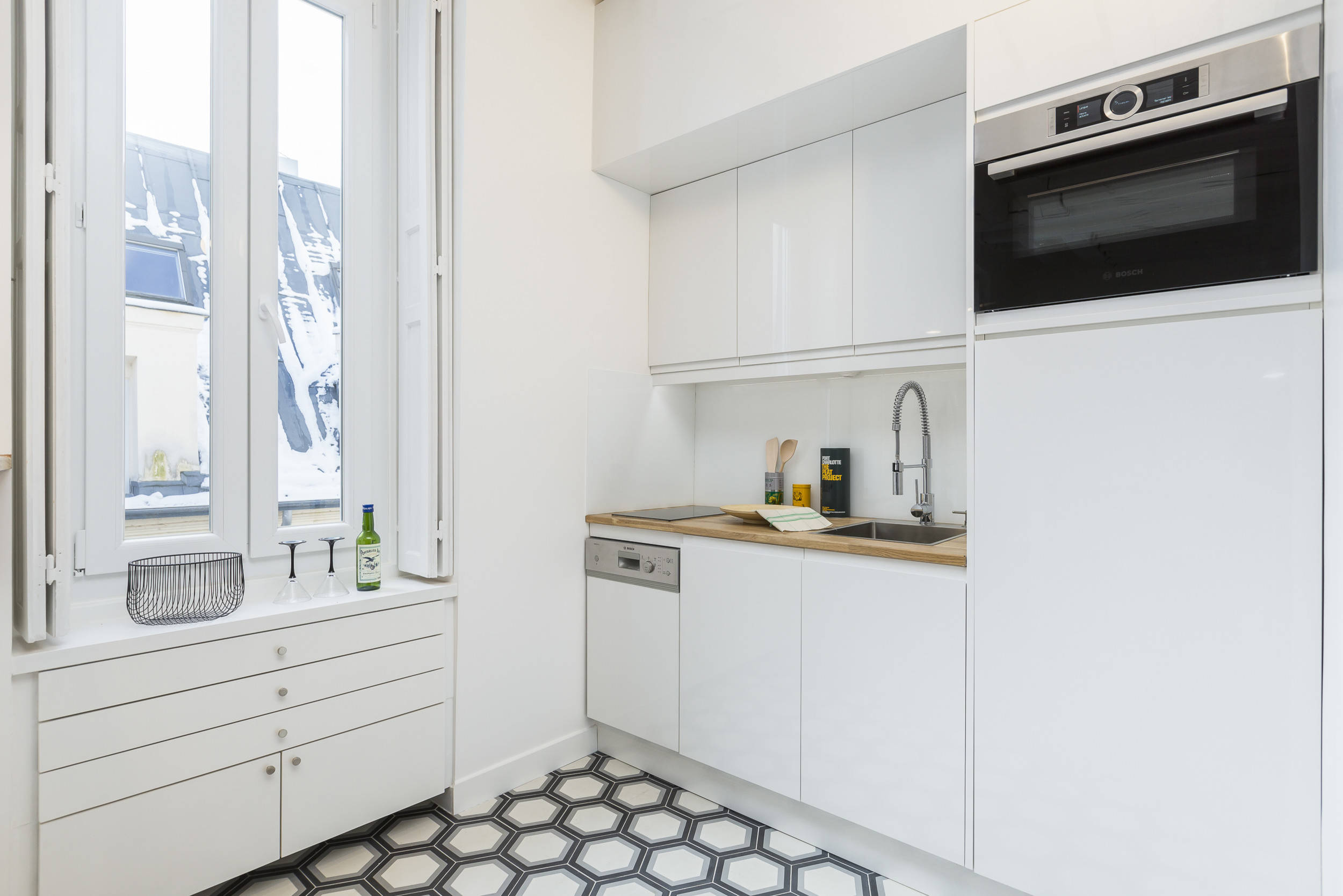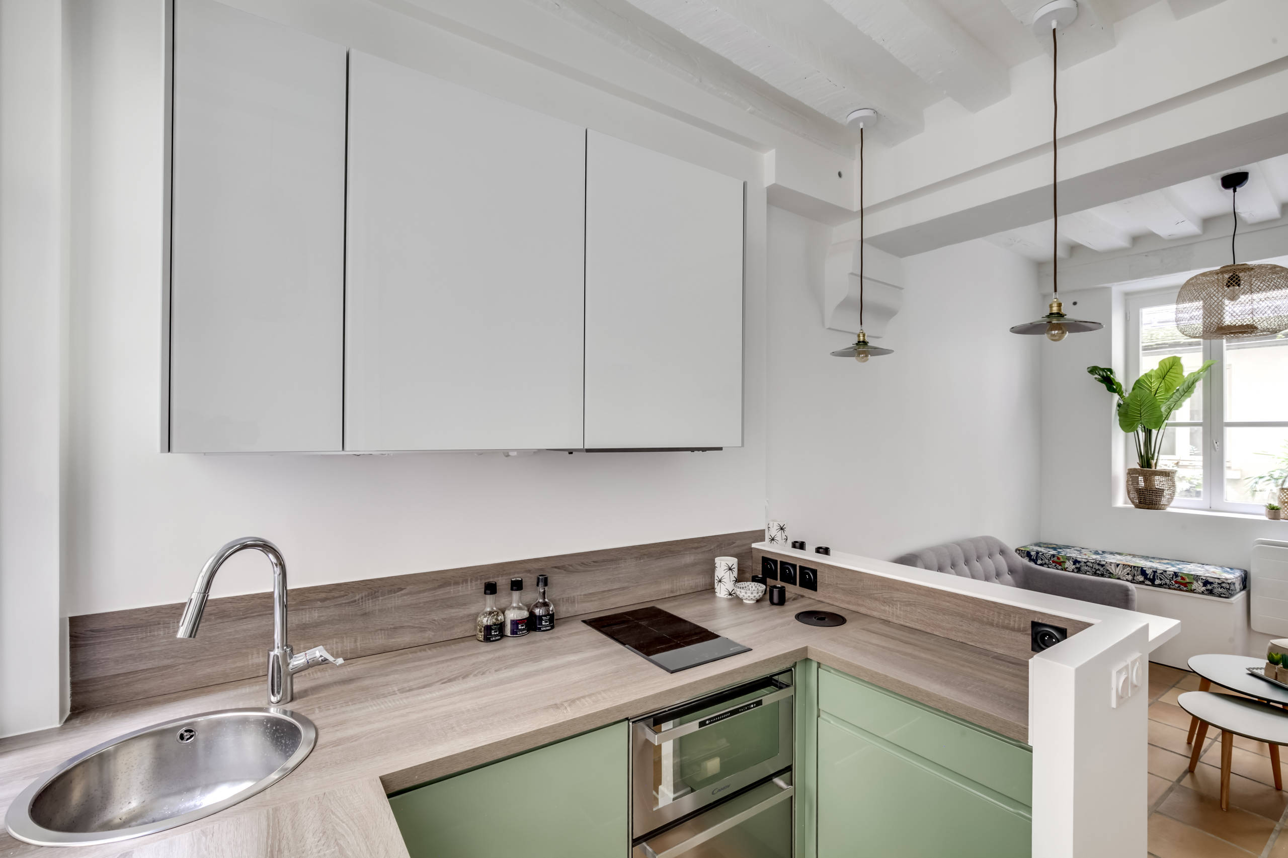 La propriétaire de cette petite surface parisienne souhaitait installer dans sa cuisine un four traditionnel de 60 cm et un micro-ondes. Carina Nahmani, la gérante de l’entreprise tout corps d’état Qualirénovation lui a proposé une une solution gain de place inédite grâce à une hotte/micro-ondes encastrable.